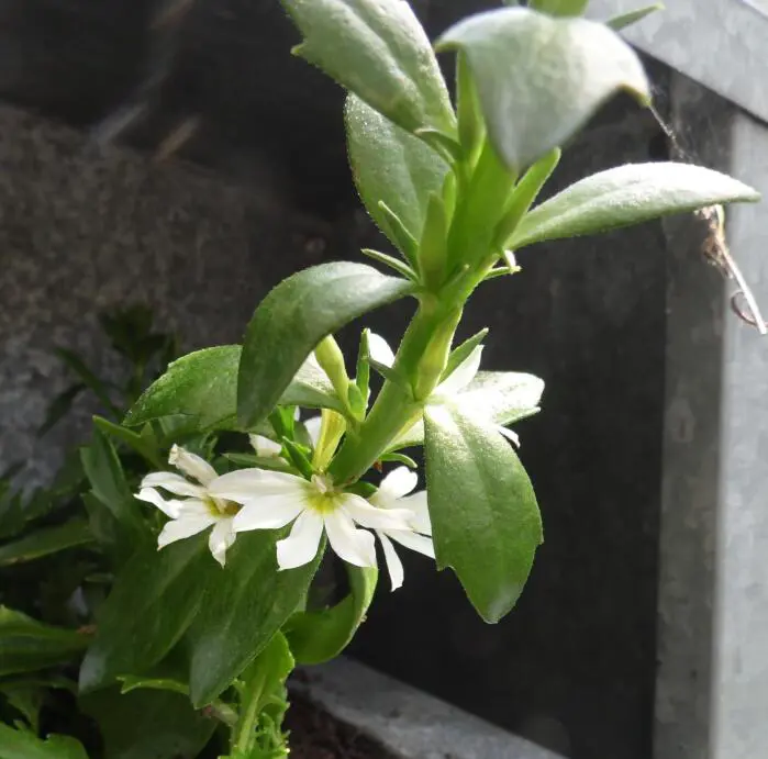 Scaevola aemula 'WHIRLWIND White' is een ideale balkonplant die goed te gebruiken is voor hangmanden.