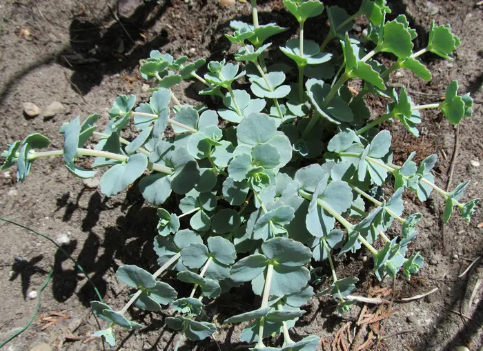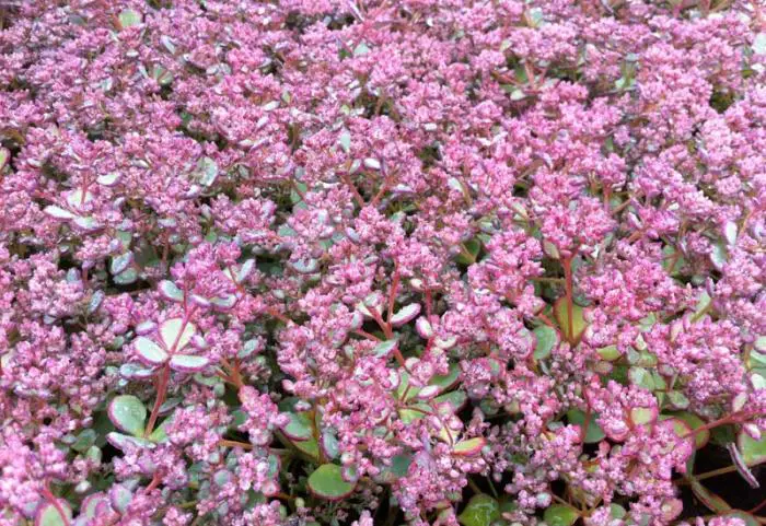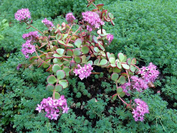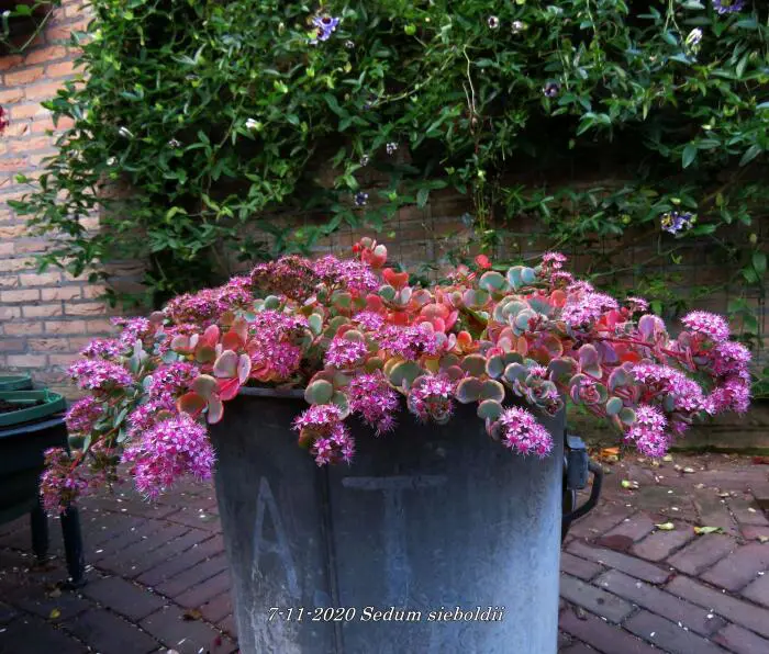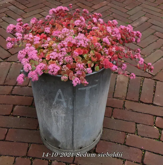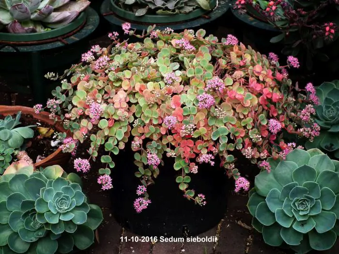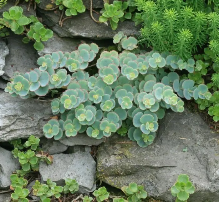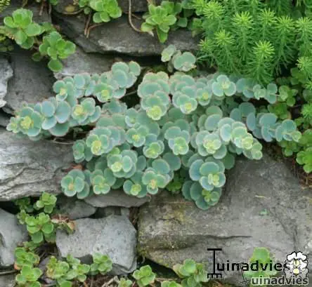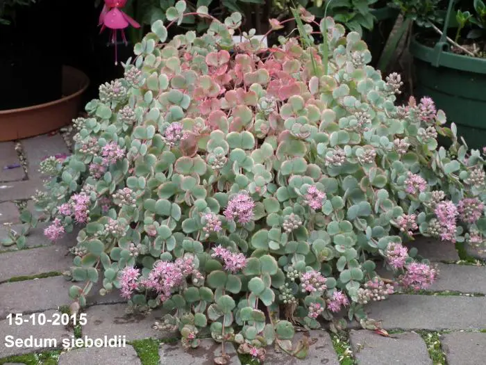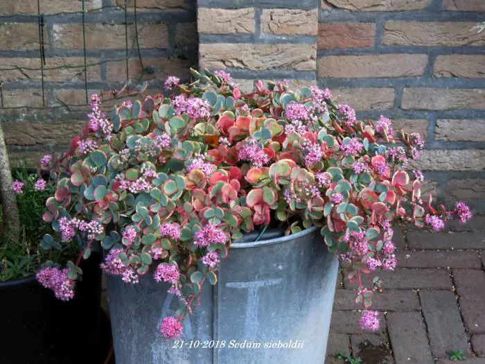 Sedum sieboldii is een uitstekende bodembedekker met dikke ronde blauwgroene blaadjes. Later in het jaar kleuren de bladranden paarsrood.