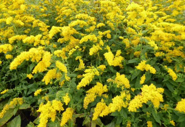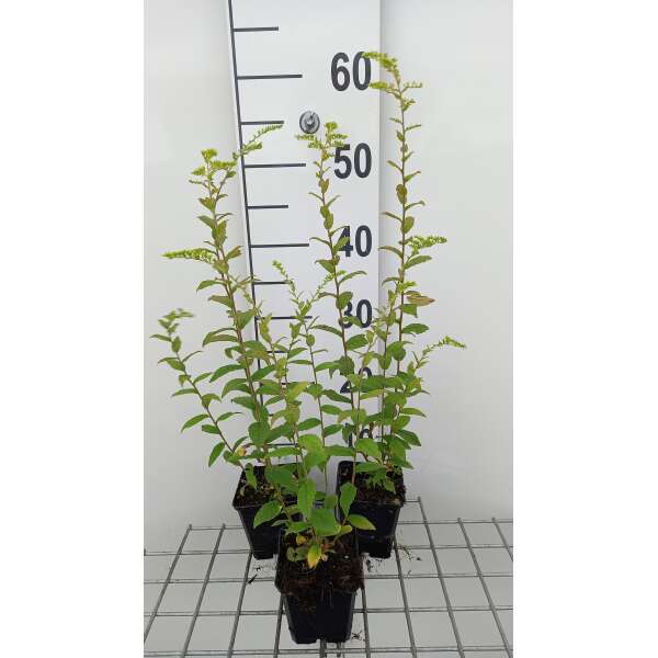 Solidago rugosa is een rechtopstaande vaste plant met smal lancetvormig, dun getand groen blad.