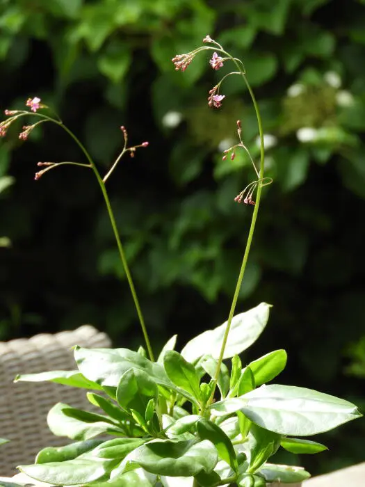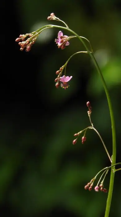 Heeft relatief grote bladeren en bloeit met luchtige pluimen van kleine paarsroze bloempjes.