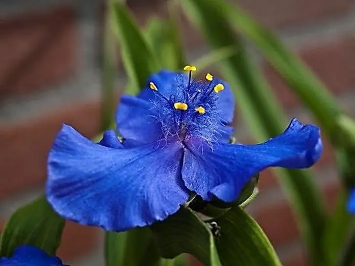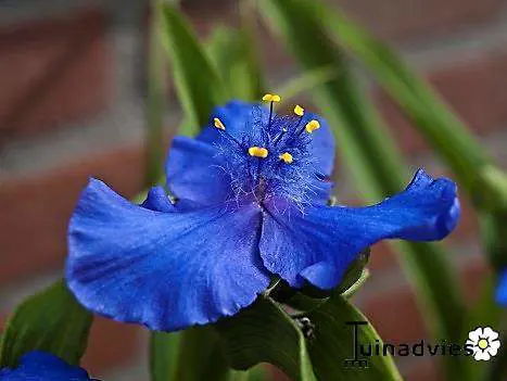 Het is een langbloeiende plant waarvan elke bloem maar 1 dag bloeit met telkens gele afstekende stamper. De azuurblauwe bloemen staan in bundels van 3 aan een stengel.