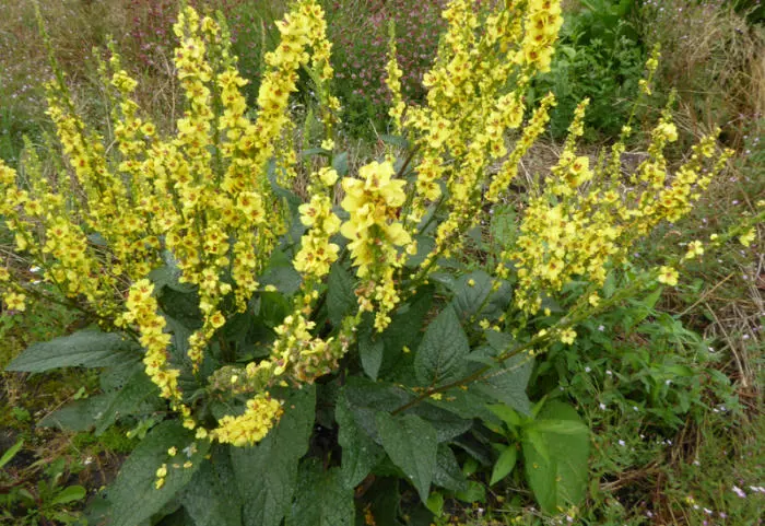 Aan een lange dikke stengel bloeien de gele bloempjes met paarse wollig meeldraden.