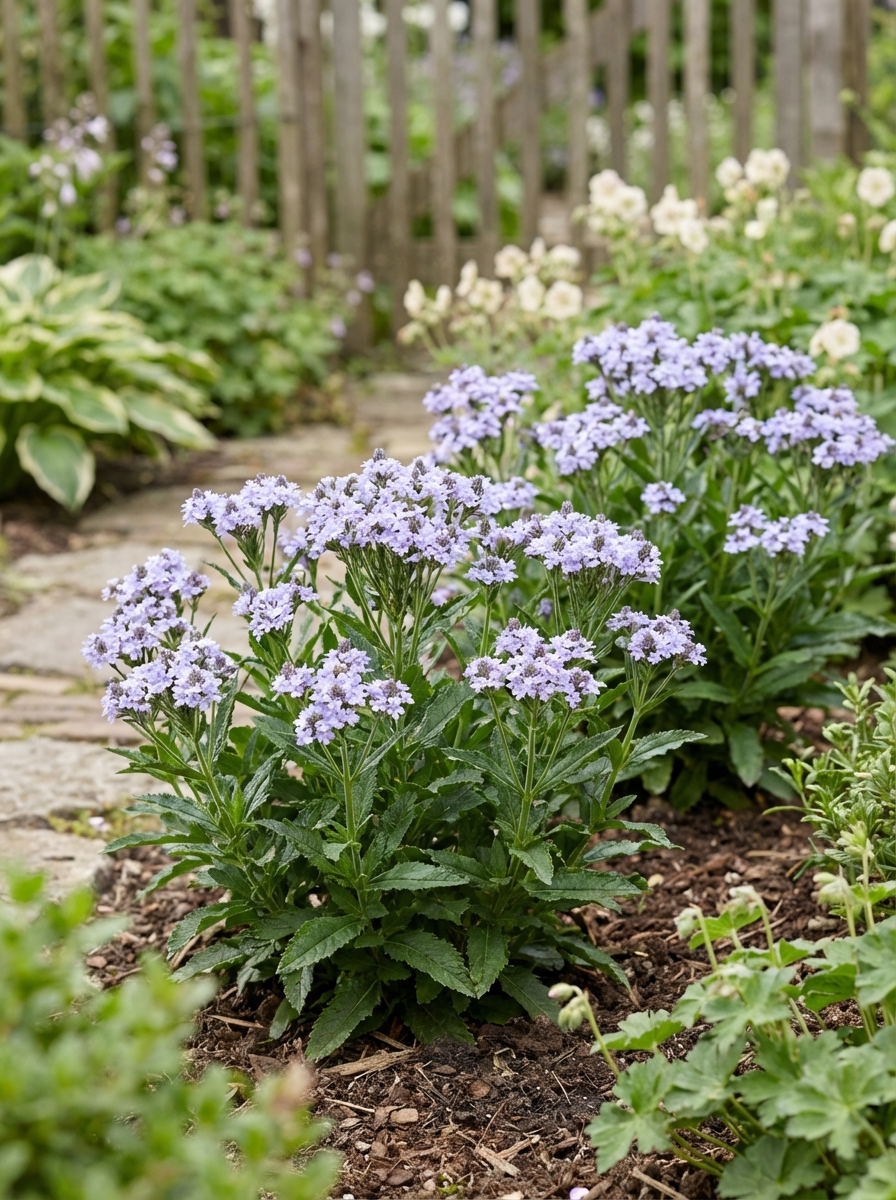 Verbena rigida 'Polaris' is een winterharde Zuid-Amerikaanse vaste plant, lang bloeiend met dichte aren van geurige witlila bloemen.