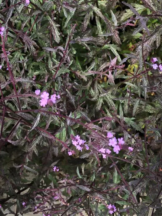 Verbena officinalis var. grandiflora 'Bampton is een bossige rechtopstaande plant met dieppaarse bladeren en korte aren van lilapaarse bloempjes.