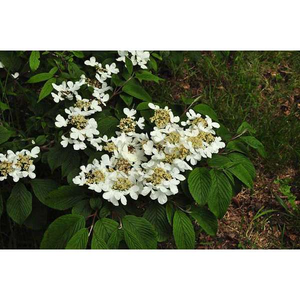 Viburnum plicatum 'Mariesii' is een zeer decoratieve heester afkomstig uit China met breed uitlopende takken die een gelaagd effect geven. Het blad is donkergroen en gerimpeld met prachtige paarsrode herfsttinten. Bloeit in mei met met groenwitte vlakke bloemschermen met witte steriele randbloemen. Na de bloei verschijnen rode bessen die naar zwart rijpen.