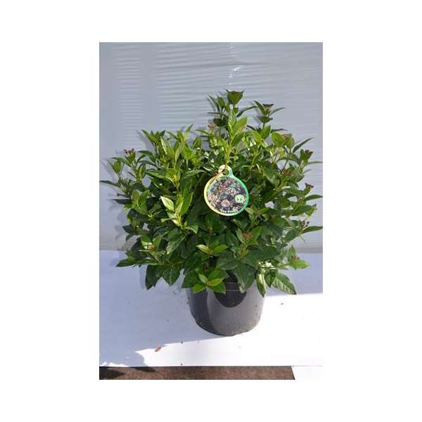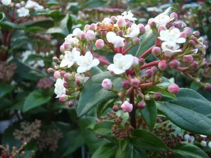 Viburnum tinus 'Eve Price' is een compacte, aantrekkelijke variëteit vanwege de trosjes roze bloemknoppen die met witte bloempjes openbloeien. De rozerode bloemknoppen hangen reeds al vanaf oktober aan de plant. Vormt een dichte struik met wintergroene, ovale glanzende donkergroene bladeren.