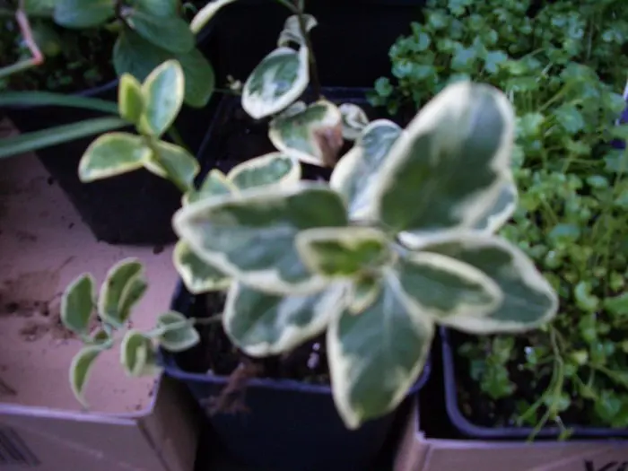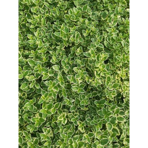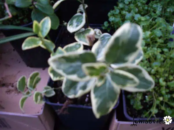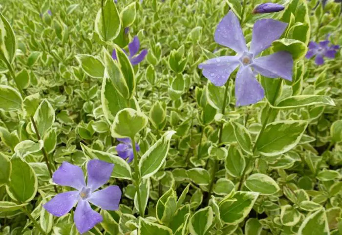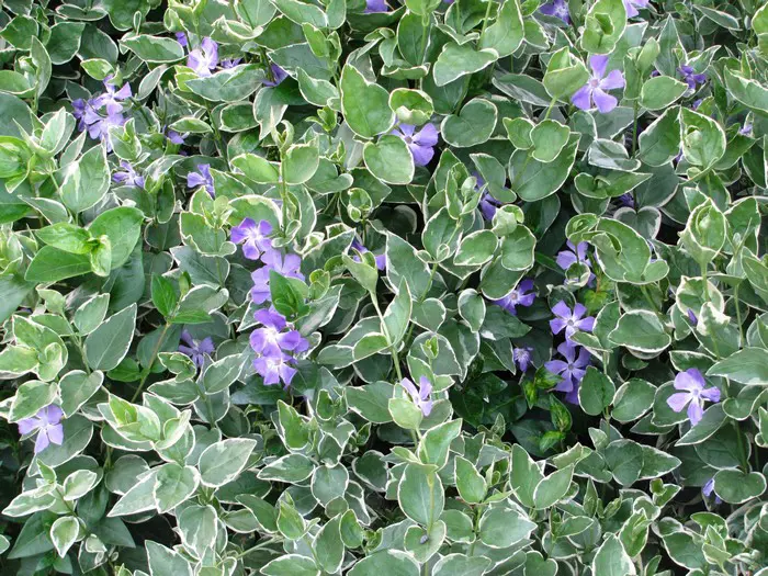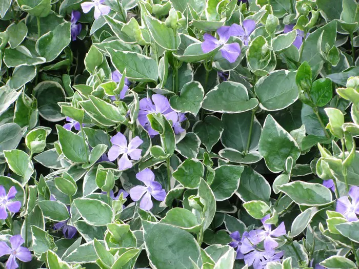 Vinca major 'Variegata' is een groeikrachtige bodembedekker met hartvormige, leerachtige, glanzende witbonte groene bladeren