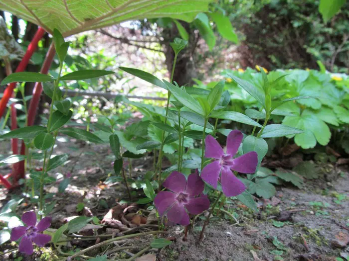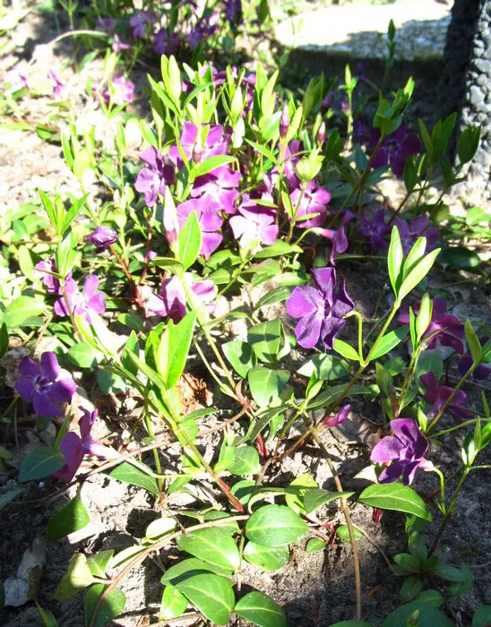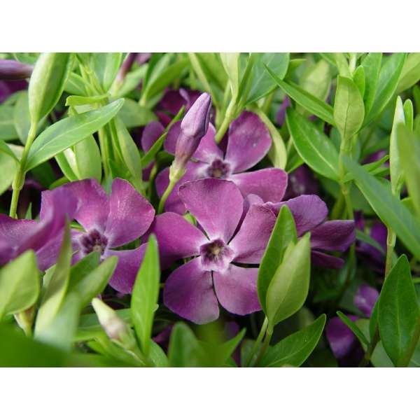 Vinca minor 'Atropurpurea' is een uitstekende tuinplant voor moeilijke plaatsen. Hij vormt een groenblijvende en dichtbegroeide bodembedekker die in het voorjaar met talrijke kleine paarsrode sterrenbloemen bloeit.