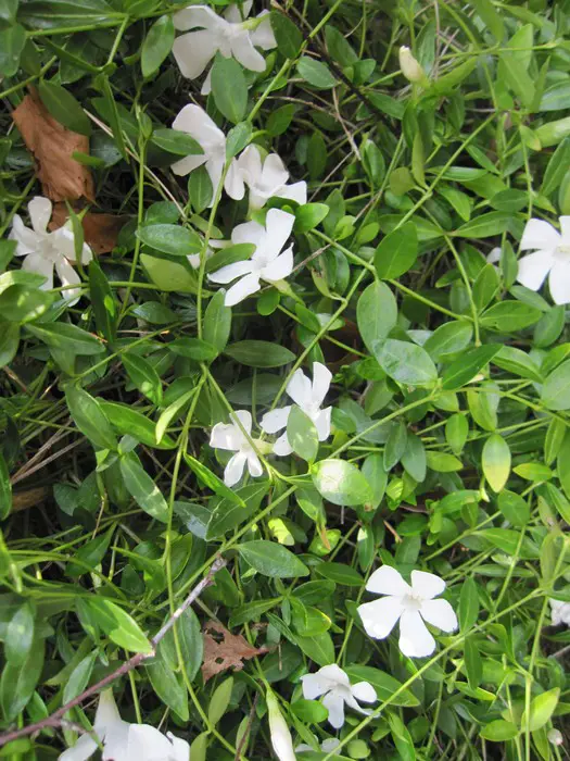 Vinca minor 'Gertrude Jekyll' is een laag groeiende variëteit (5cm).