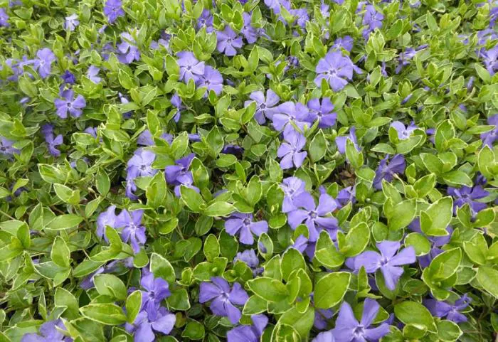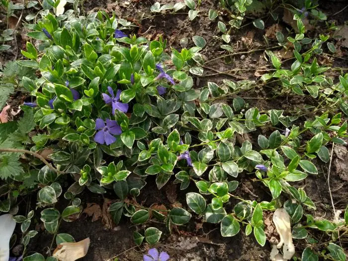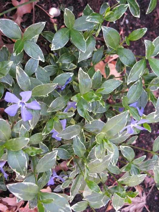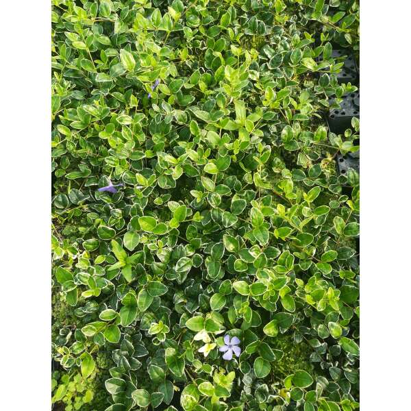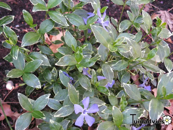 Vinca minor 'Ralph Shugert' is een uitstekende tuinplant voor moeilijke plaatsen. Hij vormt een groenblijvende en dichtbegroeide bodembedekker die in het voorjaar met talrijke kleine violet, blauwe sterrenbloemen bloeit.