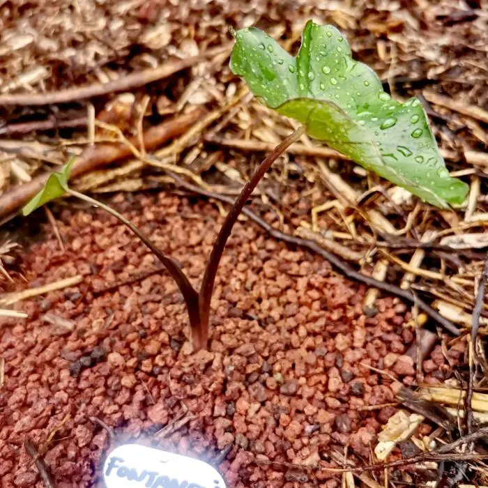 Het is een opgaand groeiende plant met grote donker olijfgroene hartvormige bladeren op donkerpaarse stengels. Kan tot 240cm hoog groeien.