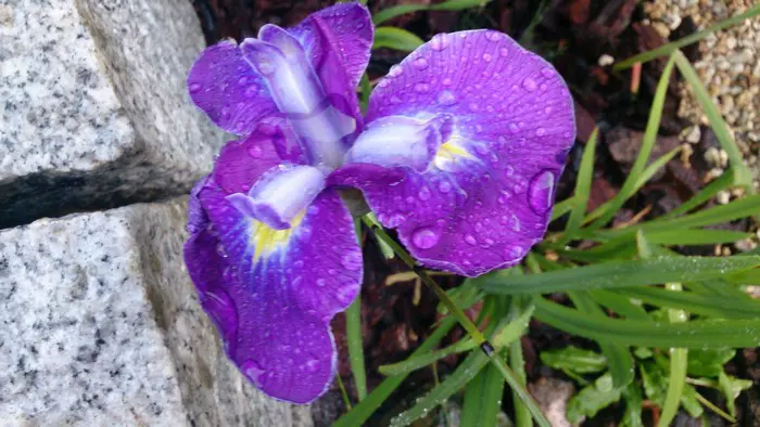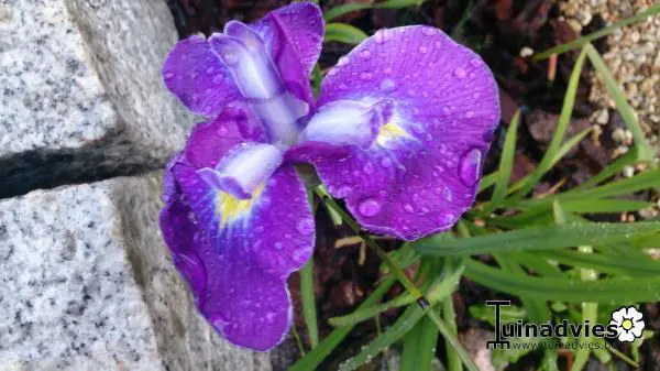 Iris ensata 'Cry of Rejoice' is een baardloze iris met een meer afgeplatte dieppaarse bloem met ietsjes geel in het hart.