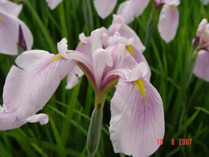Iris ensata 'Darling' bloeit met zacht lilaroze bloemen.Is meer een iris voor moeras of als oeverbeplanting te gebruiken maar kan eventueel ook in gewone vochtige volle grond groeien.