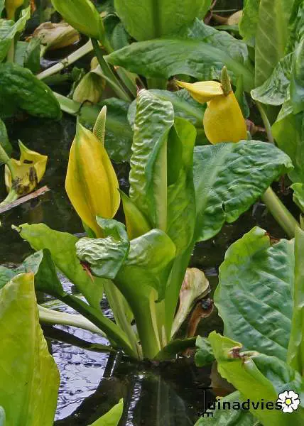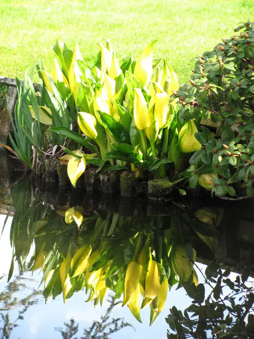 Lysichiton americanus zijn oever- of moerasplanten en bloeien voor het verschijnen van het blad met gele bloem.