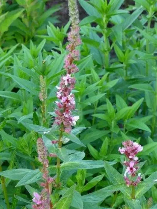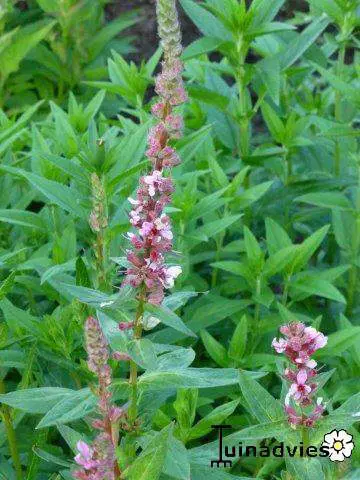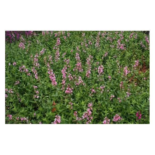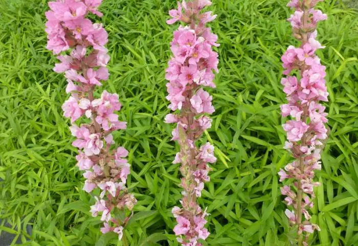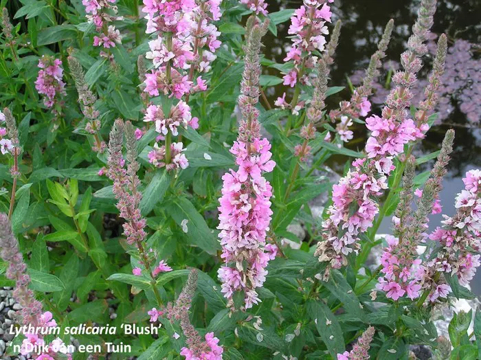 Lythrum salicaria 'Blush' bloeit op hoge stengels met zacht roze bloemen in schijnkransen.