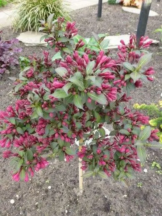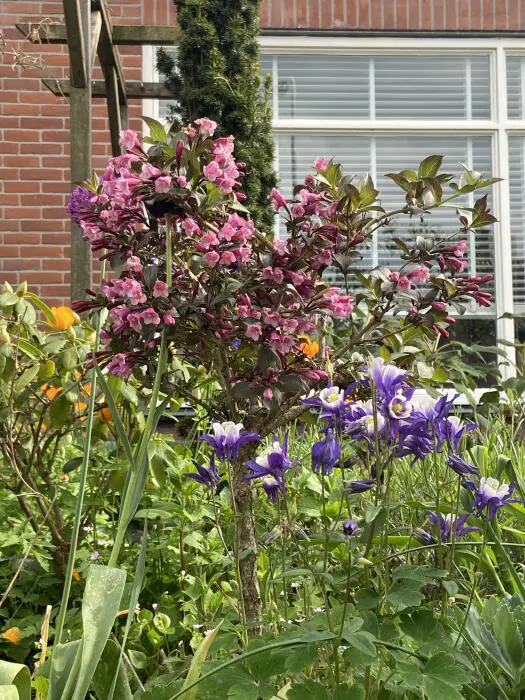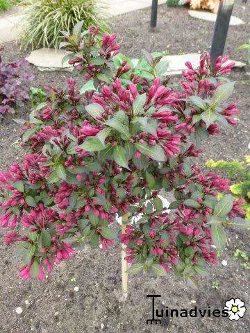 Weigela florida 'Minor Black' is een kleine bossige dwergweigelia met donkerpaarse bladeren die mooi combineren met de paarsroze bloemen.