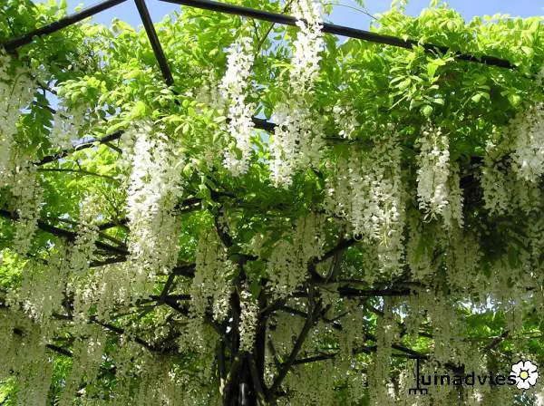 Wisteria floribunda 'Shiro-noda' is een Japanse Blauwe regen met rechtswindende ranken (met de wijzers mee) en bloeit met lange witte bloemtrossen tot 60cm lang.