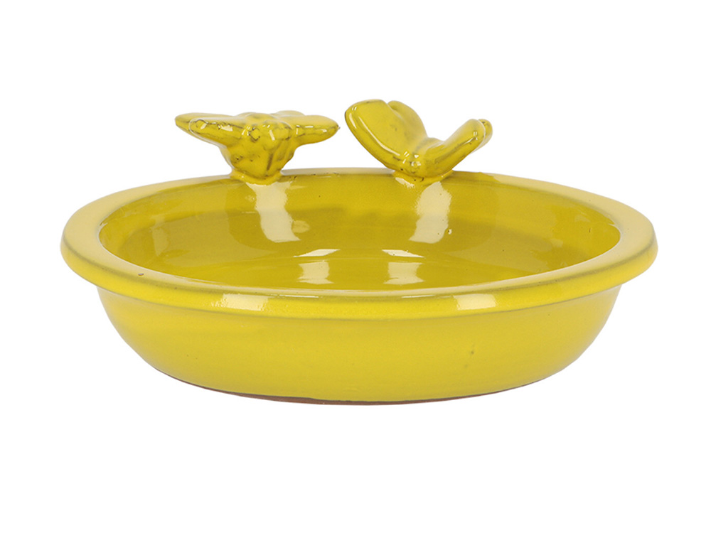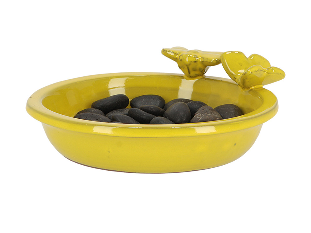 Het prachtig drinkschaaltje wordt geleverd met bijpassende zwarte stenen die je in de schaal kunt leggen. Zo hebben bijen, vlinders en andere insecten steeds een makkelijke landingsplaats. De opvallende gele kleur van de keramieken schaal is bovendien zeer aantrekkelijk voor onze kleine vrienden.