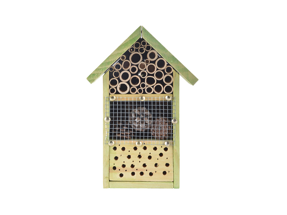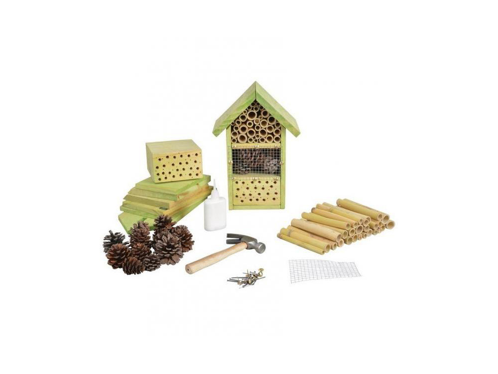 Het doe-het-zelf insectenhotel kan met de meegeleverde spijkers, hamer en houtlijm eenvoudig worden geassembleerd. Het biedt onderdak aan diverse soorten nuttige insecten zoals zachtaardige solitaire bijen die de bloemen bestuiven en oorwormen die bladluizen bestrijden in de tuin.