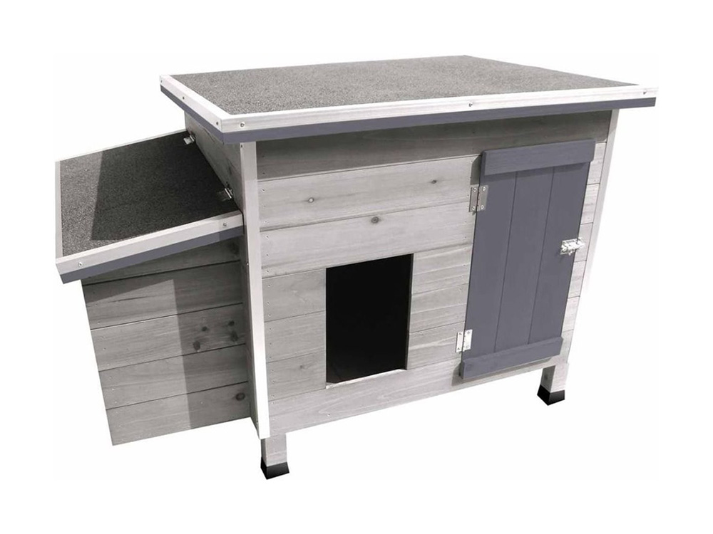 Compact kippenhok met een nachthok, legnest en 2 deuren met schuifslot. Dit hok in grenenhout is grijs gebeitst en geschikt voor een drietal kippen. De hoeken van dit hok en de dakrand zijn afgewerkt in aluminium en de vier poten zijn bekleed met rubber voor een langere levensduur.