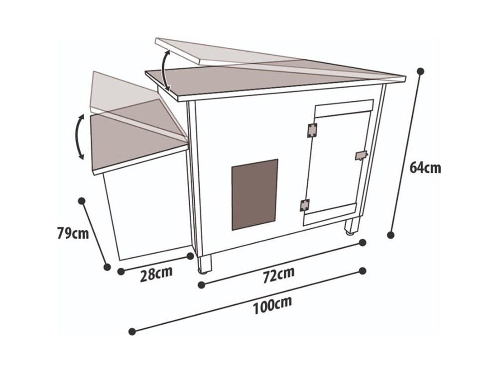 Zowel het dak van het legnest, als het dak van het kippenhok zijn afgewerkt met dakleer. Beide daken lopen schuin af voor een goede afwatering en kunnen open voor een gemakkelijke reiniging. Er is ook een draaideur in de voorzijde van het kippenhok zodat je het gemakkelijk kan reinigen.