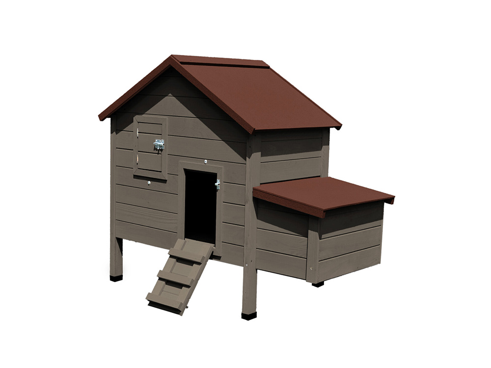 Met kippenhok Flora haal je een mooie chalet voor jouw kippen naar jouw tuin. Kippenhok Flora heeft een legnest dat je zowel links als rechts kan monteren. Via het dak van het nest kan je de eieren gemakkelijk verzamelen. Dit kippenhok staat hoog van de grond, de poten zijn beschermd door kunststof voeten. Het loopplankje is meteen ook de nachtdeur van het hok.