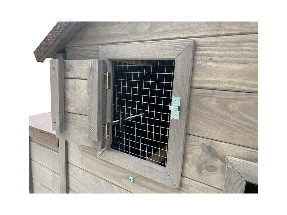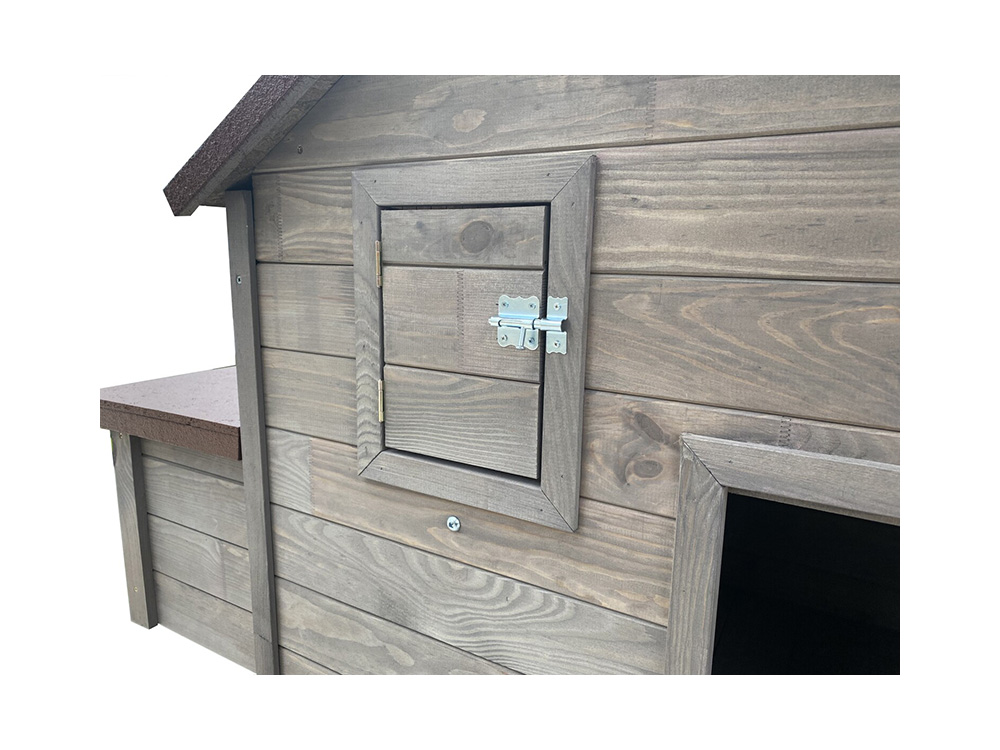 De kippenchalet is dus volledig afsluitbaar en heel eenvoudig te reinigen dankzij de ruime deur aan de zijkant tegenover het legnest. Het raampje is een leuke extra voor de verluchting van het hok, ook dit is afsluitbaar.