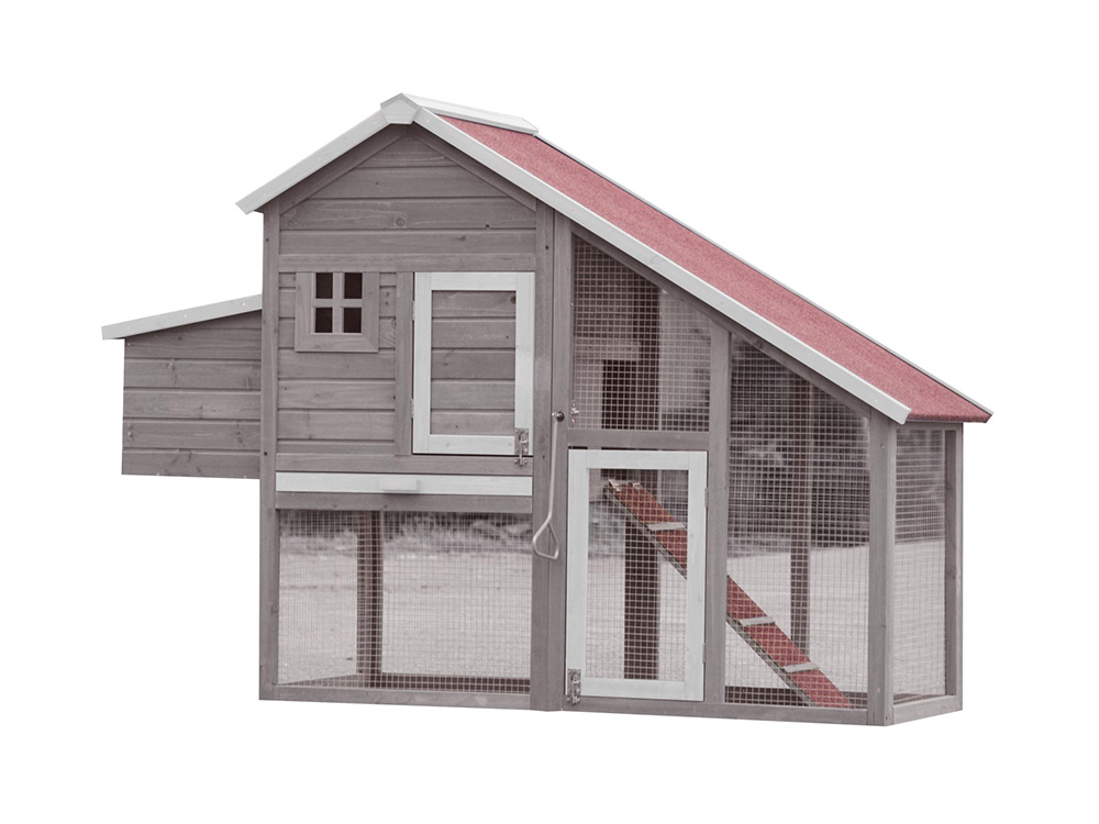 Dit kippenhok heeft het allemaal! Het hok heeft een afsluitbare, volledig overdekte buitenren die onder het nachthok doorloopt. Het nachthok is bereikbaar via een loopplank en beschikt over een legnest. Dit nest is van buitenaf bereikbaar om de eieren te verzamelen.