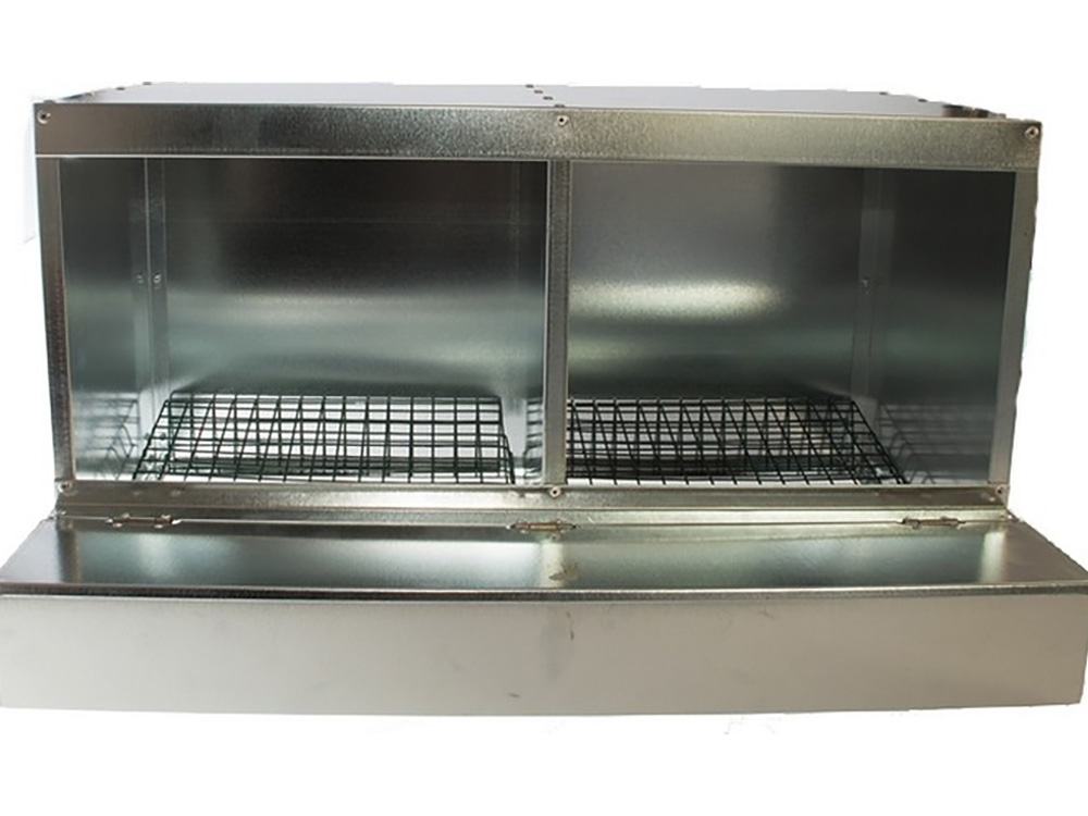 Gegalvaniseerd legnest voor 2 kippen. De bodem van dit dubbele nest bestaat uit een schuinaflopend rooster waarop de kippen hun eieren leggen. Als de kippen het nest verlaten, rollen de eieren ei over het rooster in een opvangbakje vooraan aan de legbak waar ze worden verzameld.