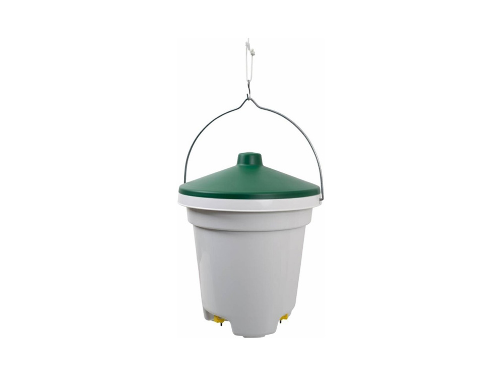 Het water in het afgesloten reservoir blijft steeds vrij van ziektekiemen. De kippen, fazanten of ander pluimvee kunnen het water opnemen via drie nippels. De emmer wordt geleverd als complete set met drie drinknippels, een deksel en een stevige hangbeugel.