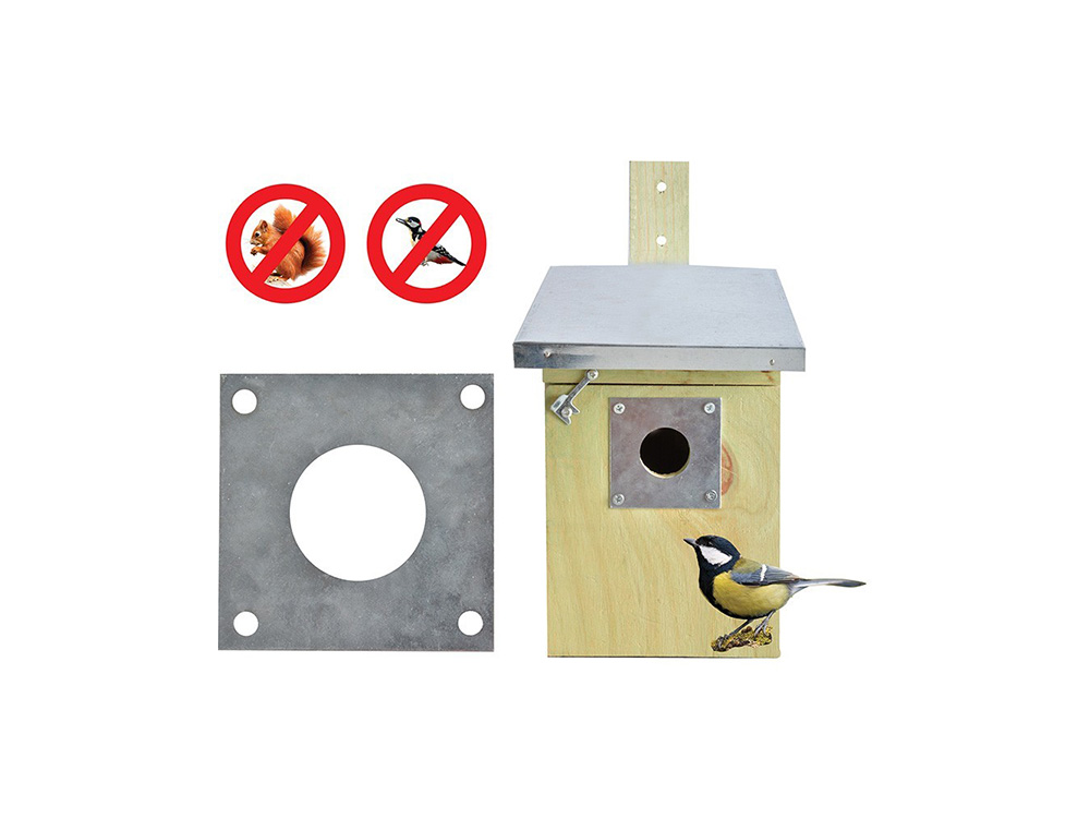 Spechten nemen soms andere nestkasten in bezit door de invliegopening verder uit te hakken. Het gebeurt ook dat eekhoorns de eieren roven van broedende vogels of zelf de jonge vogels opeten. Het beschermingsplaatje heeft een invliegopening met een diameter van 32 millimeter waardoor het nog steeds geschikt is voor koolmezen en andere meesjes maar het niet meer verder uitgetimmerd kan worden.