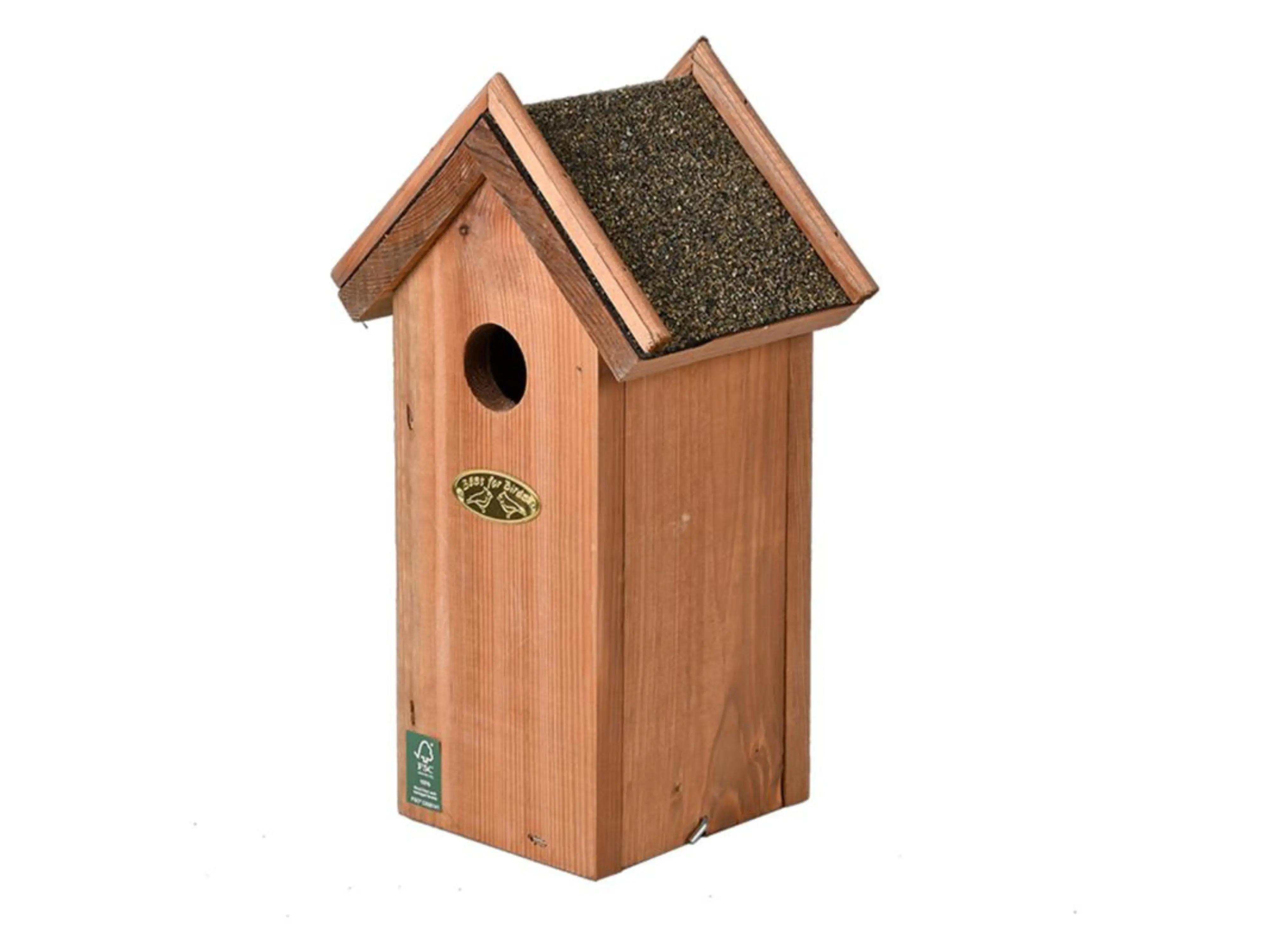 Het stevige bitumen dak beschermt het nest tegen regen, terwijl de zijkant met deurtje het makkelijk maakt om de kast in het najaar schoon te maken. Zo blijft de nestkast in topconditie en kunnen vogels er ook in de winter in schuilen tegen kou en slecht weer.