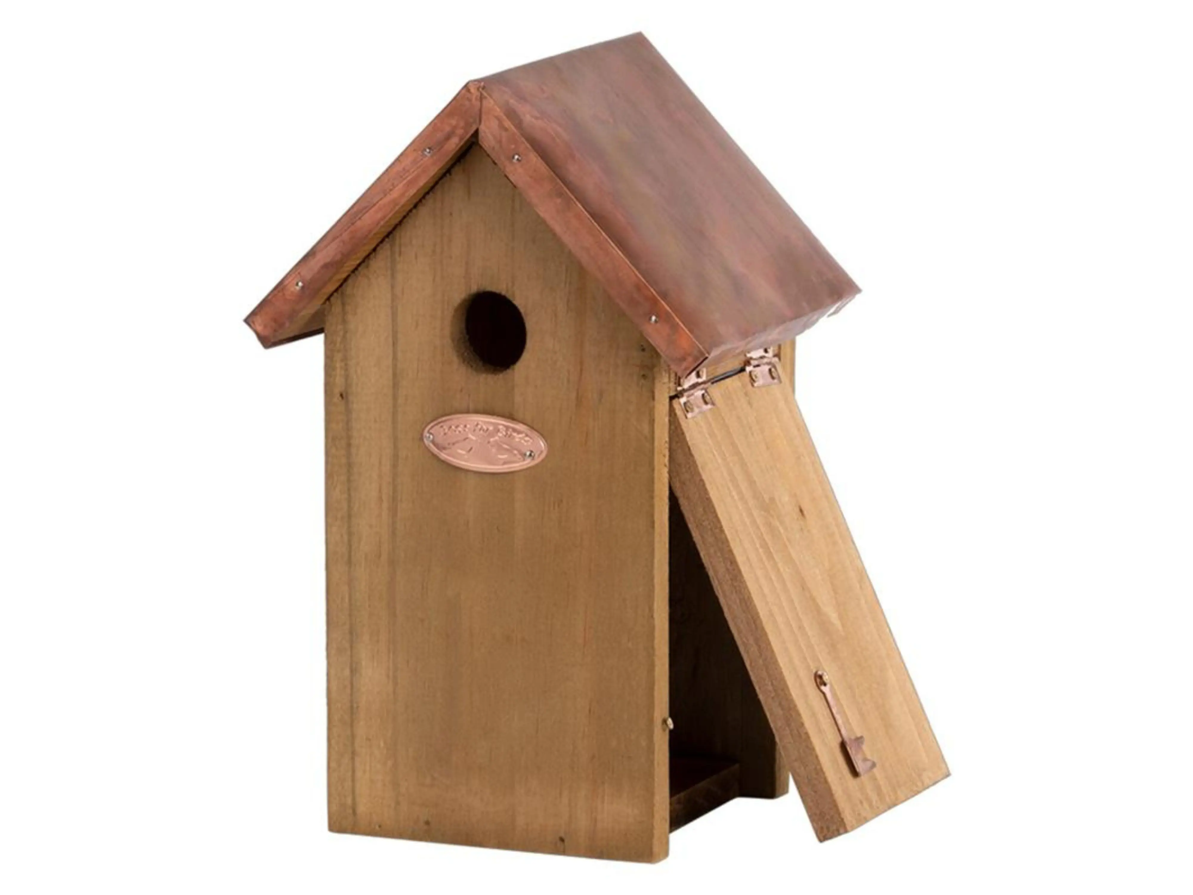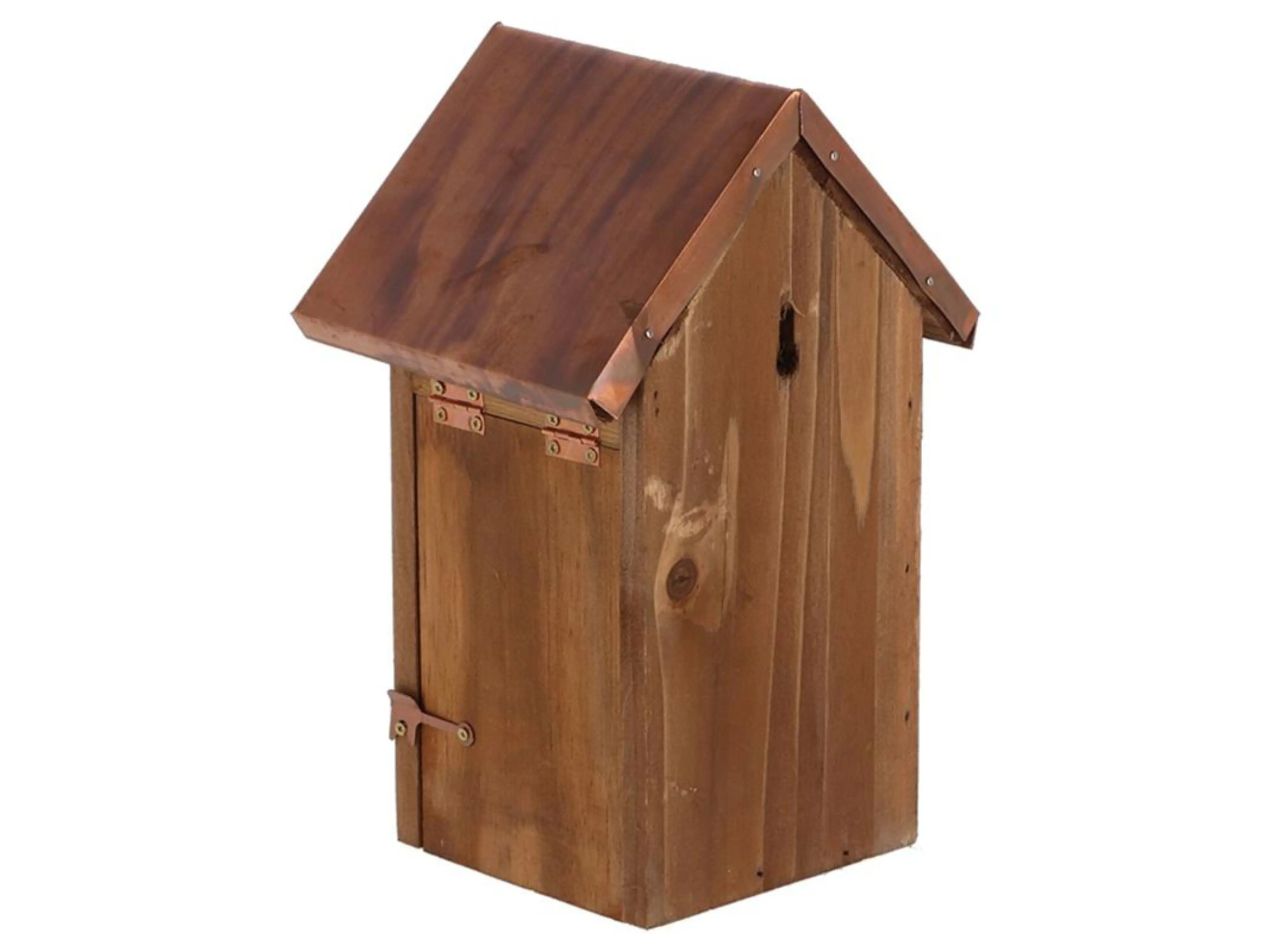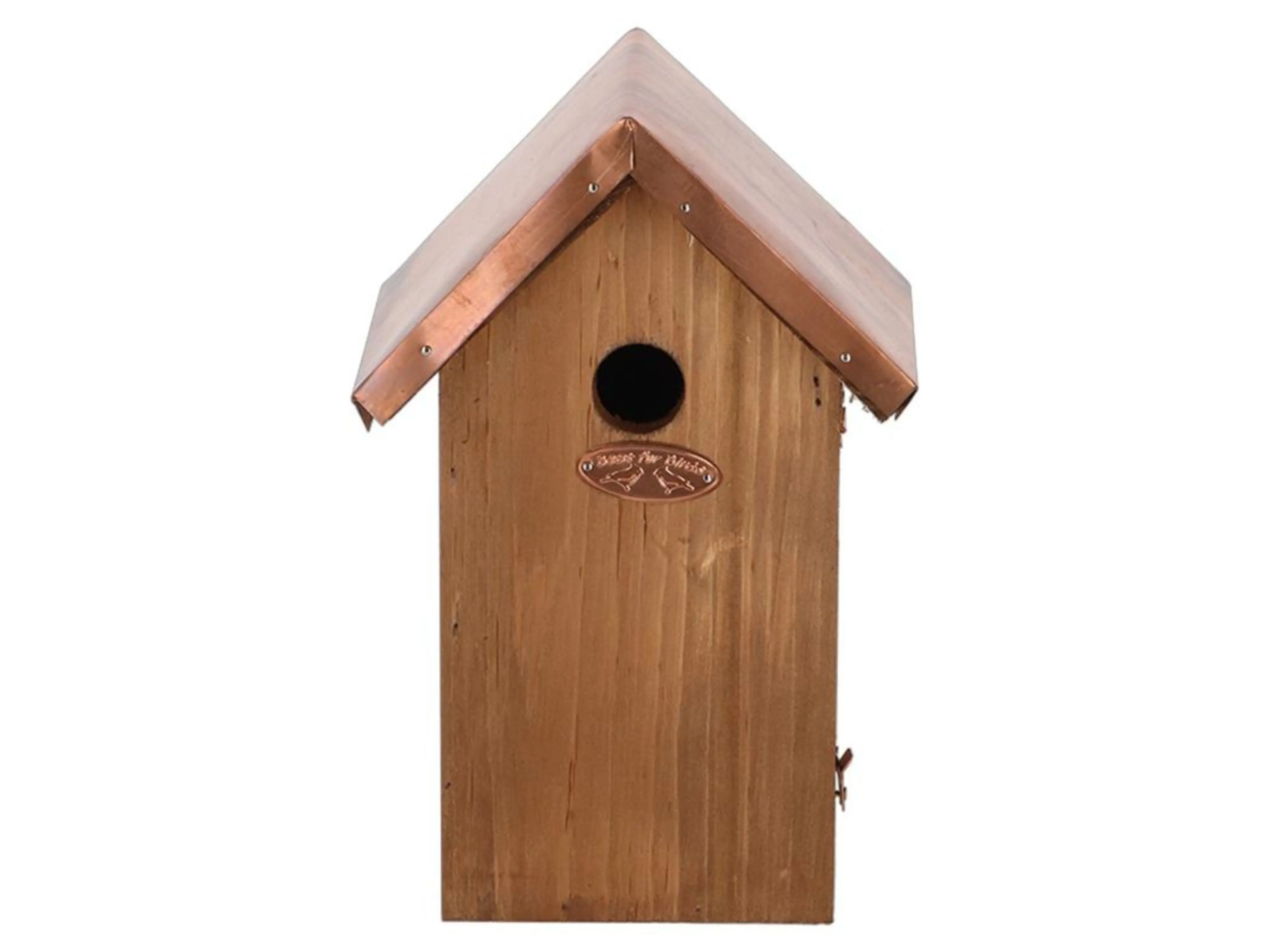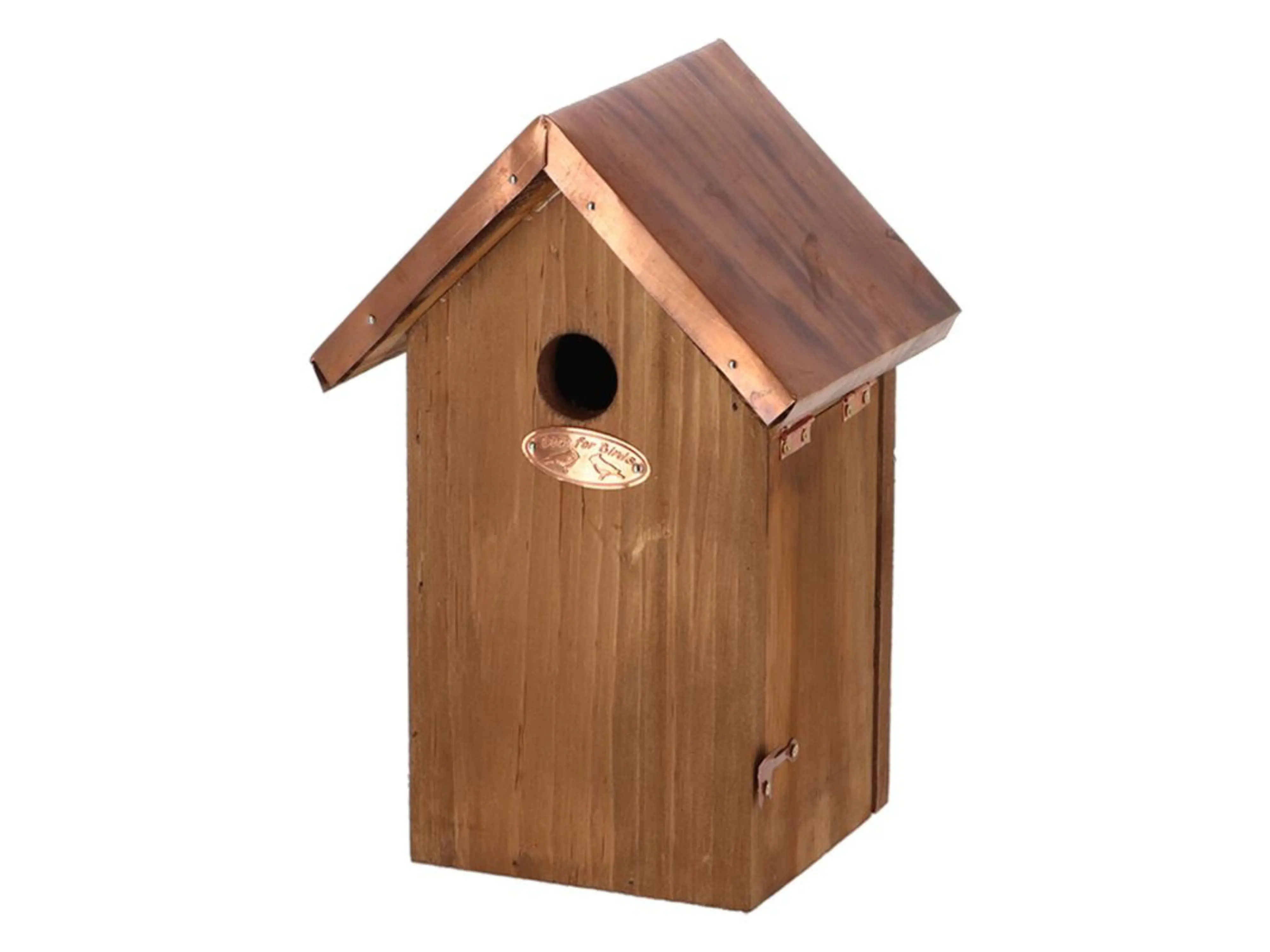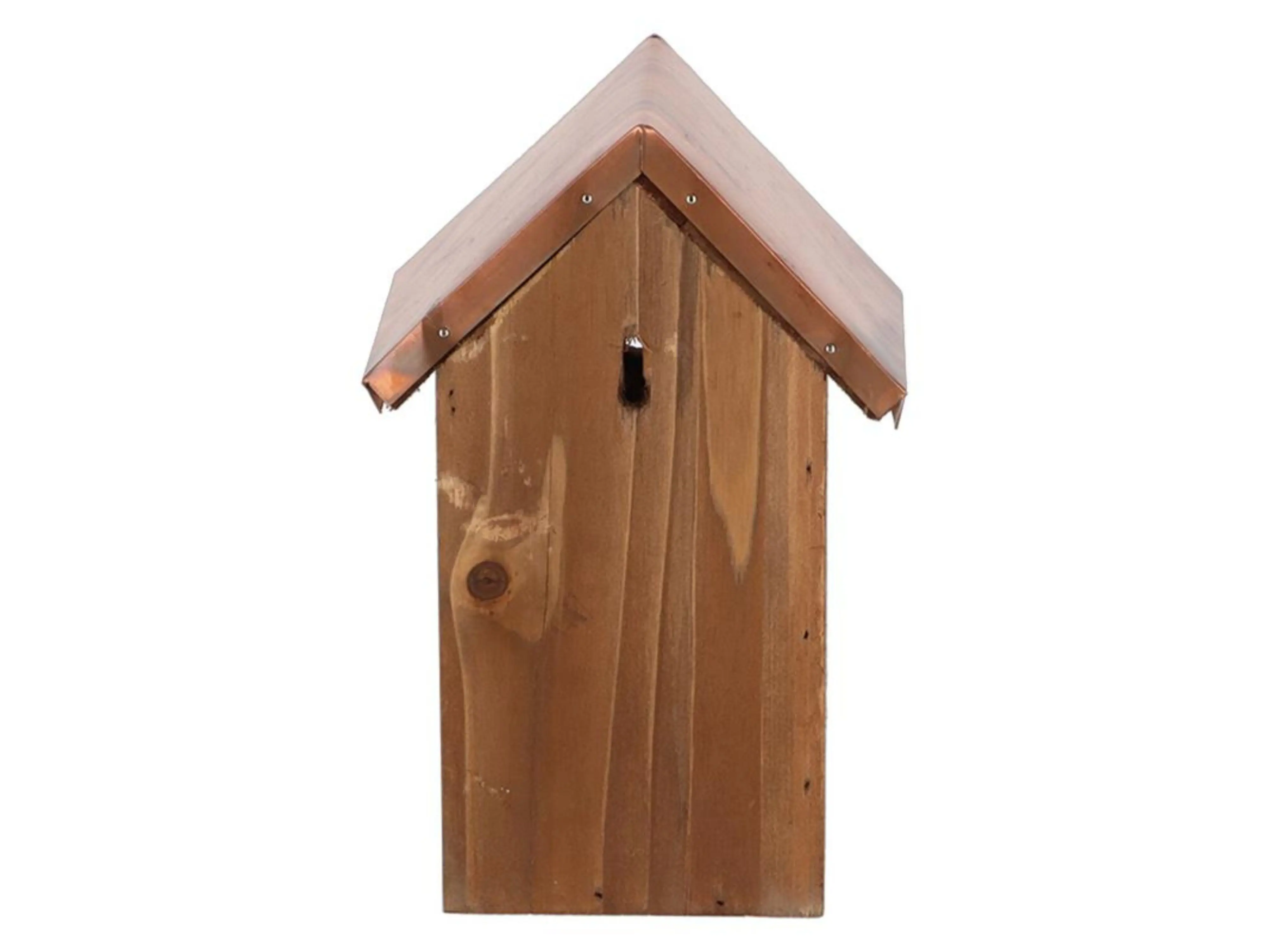 Deze traditionele nestkast met landelijke uitstraling en stijlvol koperen dak biedt een veilige nest- en schuilplek voor verschillende kleine mezensoorten, waaronder de pimpelmees, kuifmees, glanskop, matkop en zwarte mees. Door de vliegopening van 27 mm is de nestkast perfect afgestemd op deze vogels, en biedt hij bescherming tegen roofdieren en grotere vogelsoorten.