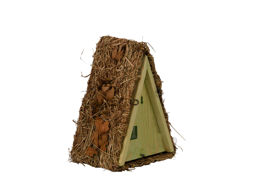 De winterkoning is een klein vogeltje dat houdt van een goed verstopt en gecamoufleerd nest. Daarom is deze nestkast bekleed met takjes, mos en grassen. Hierdoor gaat het volledig op in zijn omgeving en valt het niet op.