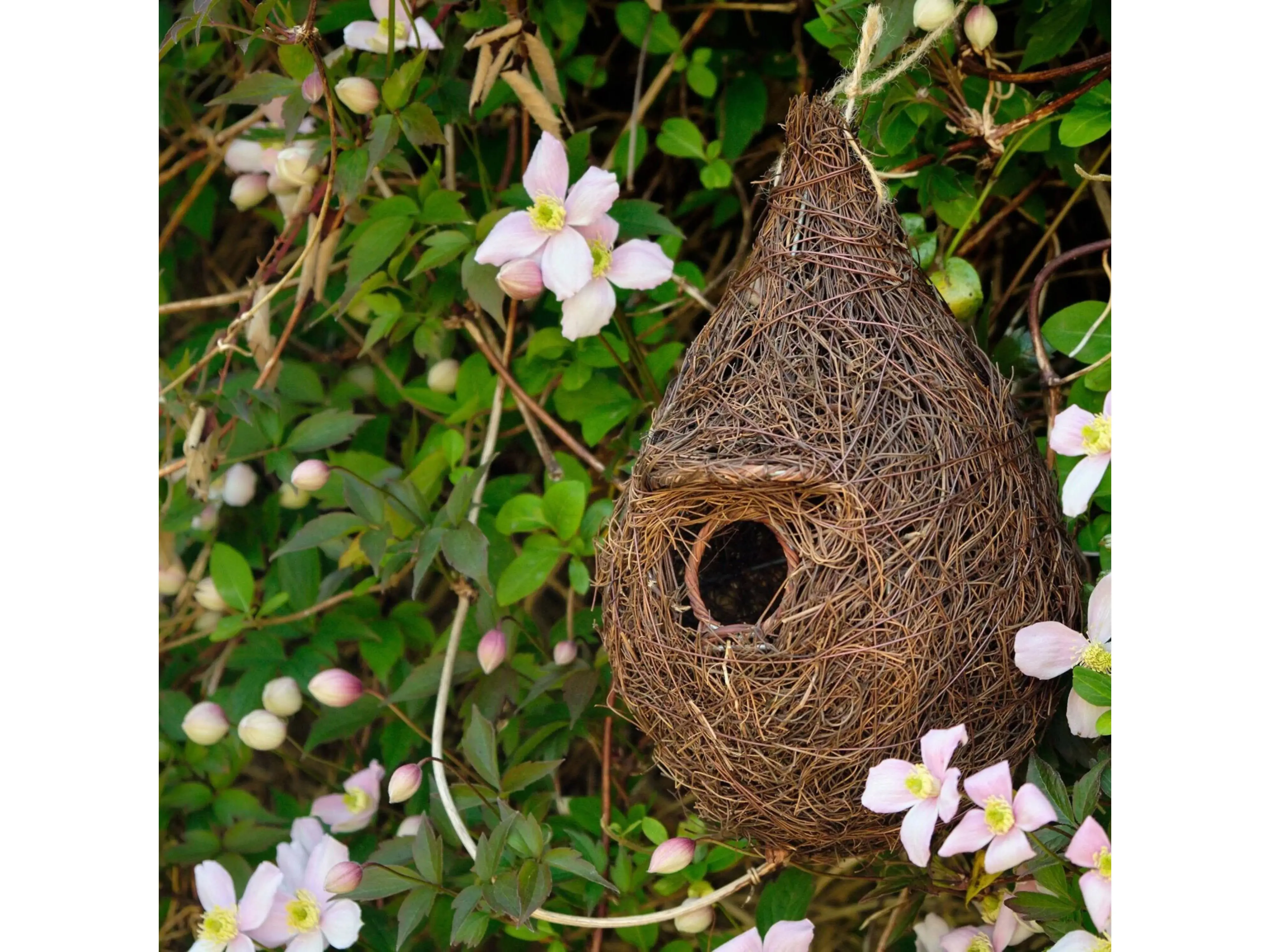 Deze 'Giant Roost' nestbuidel is voorzien van een stevig binnenframe en heeft een natuurlijke bekleding van kruipelhout dat zeer dicht aanleunt tegen een nest dat de vogels zelf hebben gebouwd. De kleine ronde ingang heeft een rotan drempel die dienst doet als landingsplatform. Een schattig portaaltje houdt de slagregen buiten.