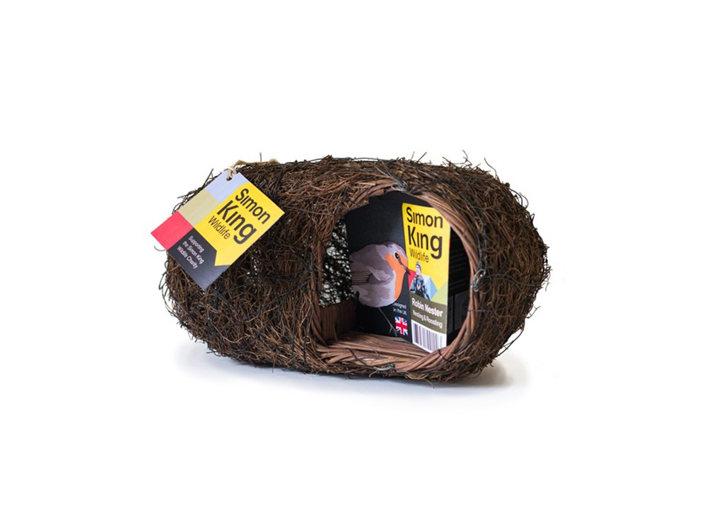 Deze unieke nestbuidel is ontwikkeld in samenwerking met Simon King, natuurkenner en wildlife cameraman, gebruik makend van zijn jarenlange kennis. Roodborstjes geven de voorkeur aan een open nestkast die makkelijk toegankelijk is maar toch verborgen is voor predatoren. De ingang is open maar de nestruimte zelf is verborgen achter de zijwand en bedekt door het dak. De basis van de buidel is van rotan met een lage scheidingswand tussen de ingang en de nestplaats.