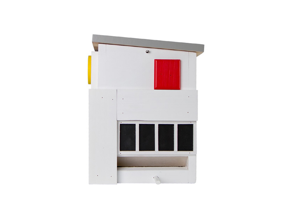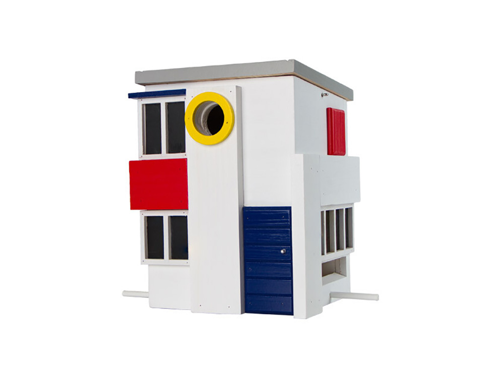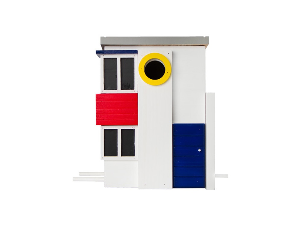 Deze moderne vogelvilla kan, afhankelijk van het seizoen, als nestkast of als voederhuis worden gebruikt. Het huisje is ontworpen volgens de modernistische architectuur van De Stijl, een Nederlandse kunstbeweging die Mondriaan oprichtte in 1917. De strakke lijnen en geometrische vormen in combinatie met de drie primaire kleuren rood, blauw en geel maken deze villa tot een leuke toevoeging voor de tuin.