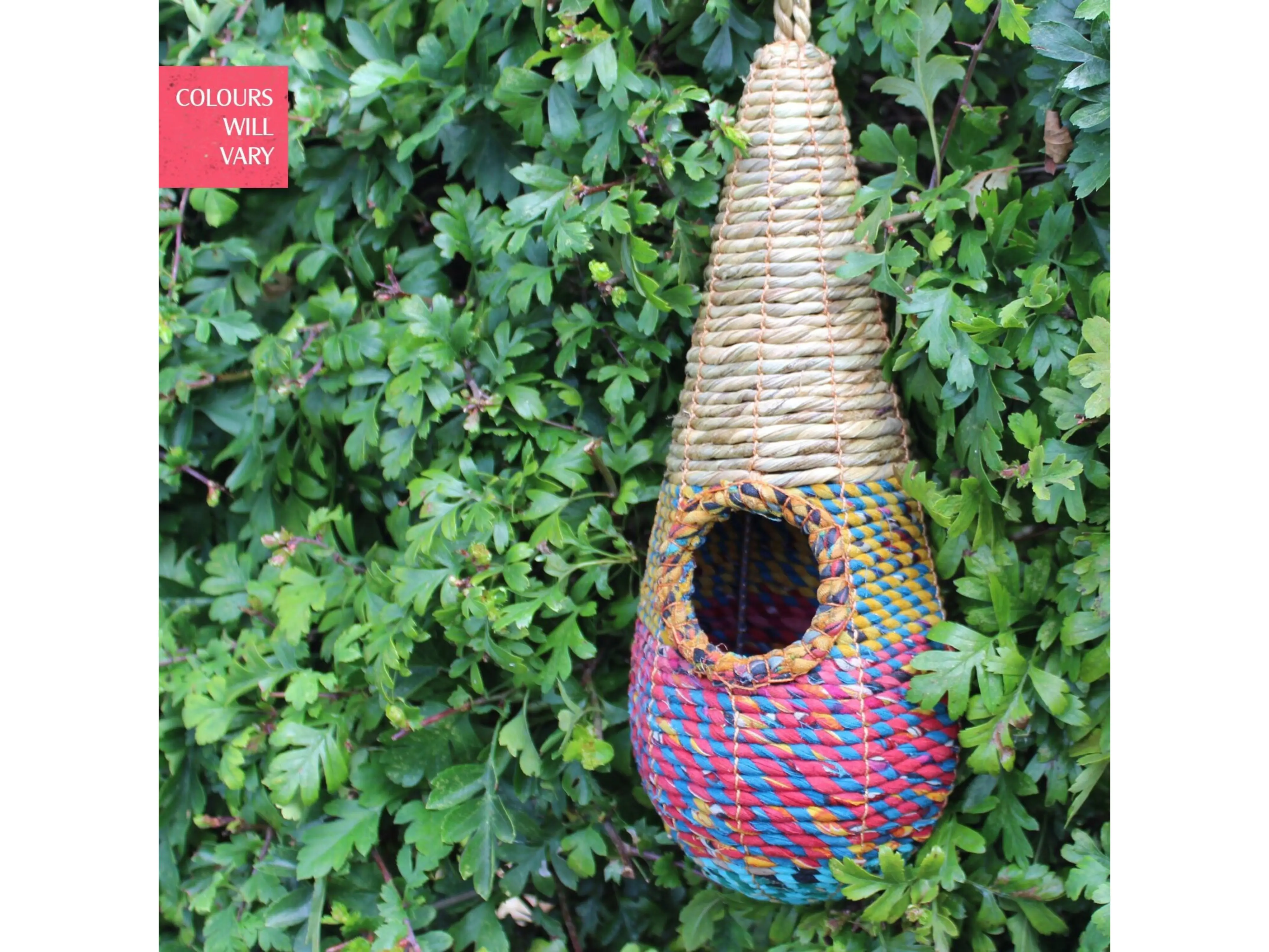 Elk nester is uniek in kleur! Het nest bestaat uit kleurrijke gerecyclede sari-patroon waardoor elk nester anders is. De invliegopening is geschikt voor kleine tuinvogels die alleen of met z'n tweeën op zoek zijn naar een nestplaats.