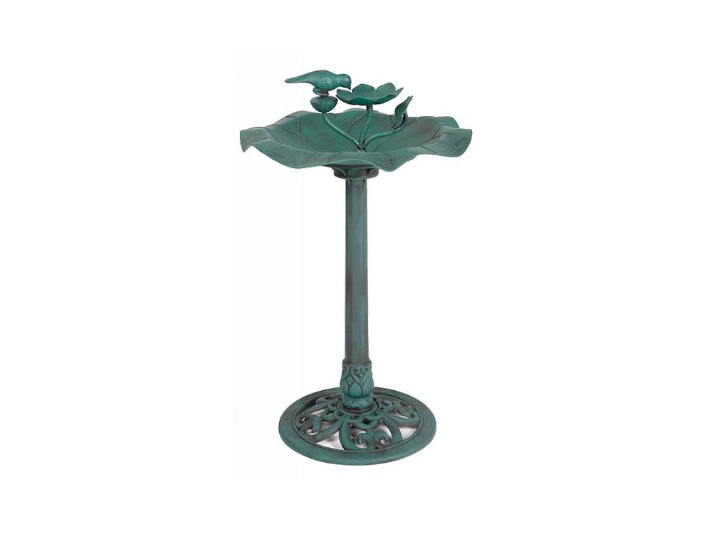Een prachtige waterschaal in de vorm van een lotusblad met daarin een bloem en een drinkende vogel. Deze waterschaal is de ideale plaats voor tuinvogels die nood hebben aan water om te drinken of te baden.