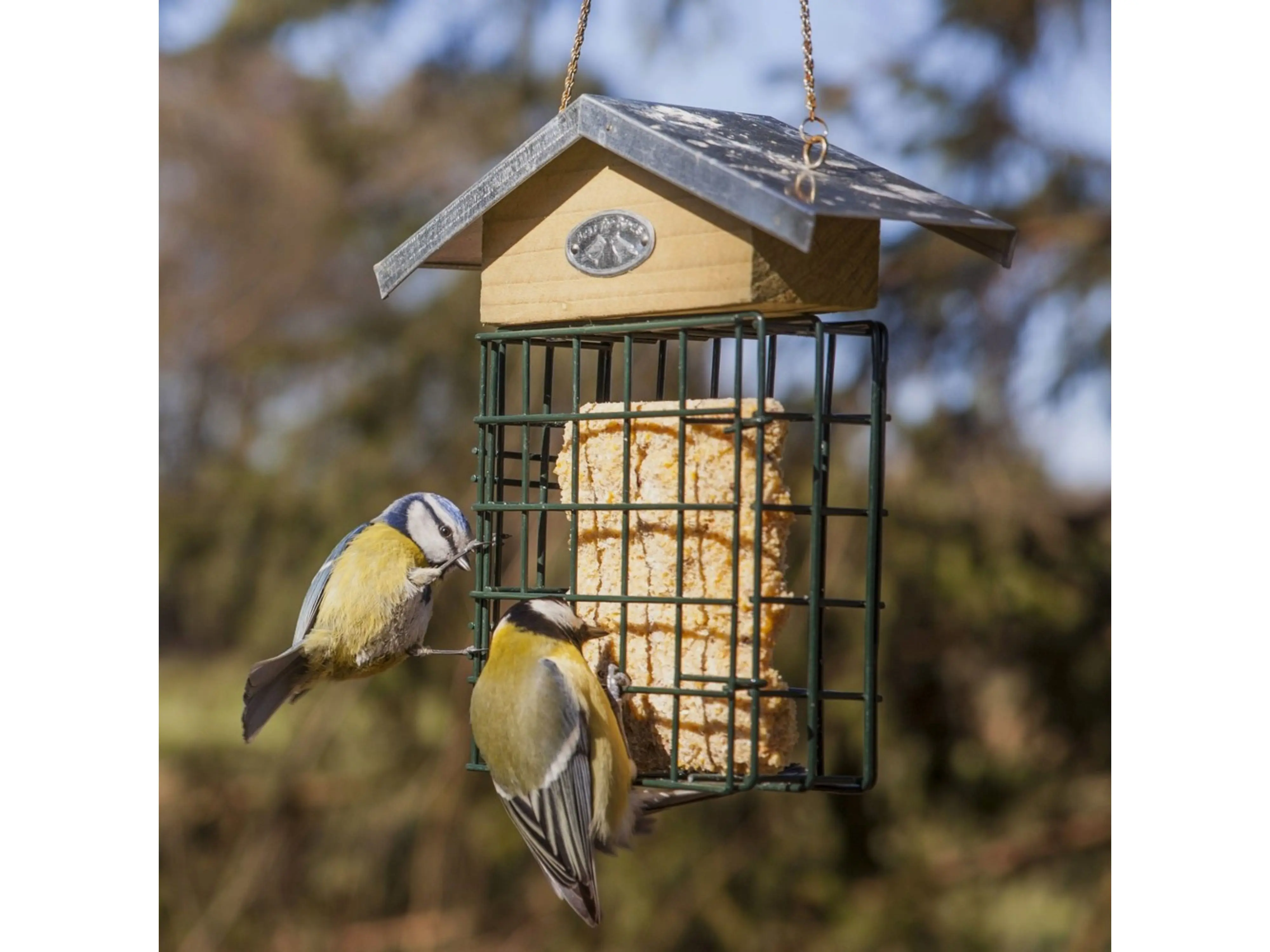 Het bijvullen gaat heel eenvoudig: open simpelweg de voorklep en plaats een nieuw vetblok. De houder is voorzien van een stevige metalen ophangketting, waarmee je hem gemakkelijk aan een tak, haak of voedersysteem hangt.
