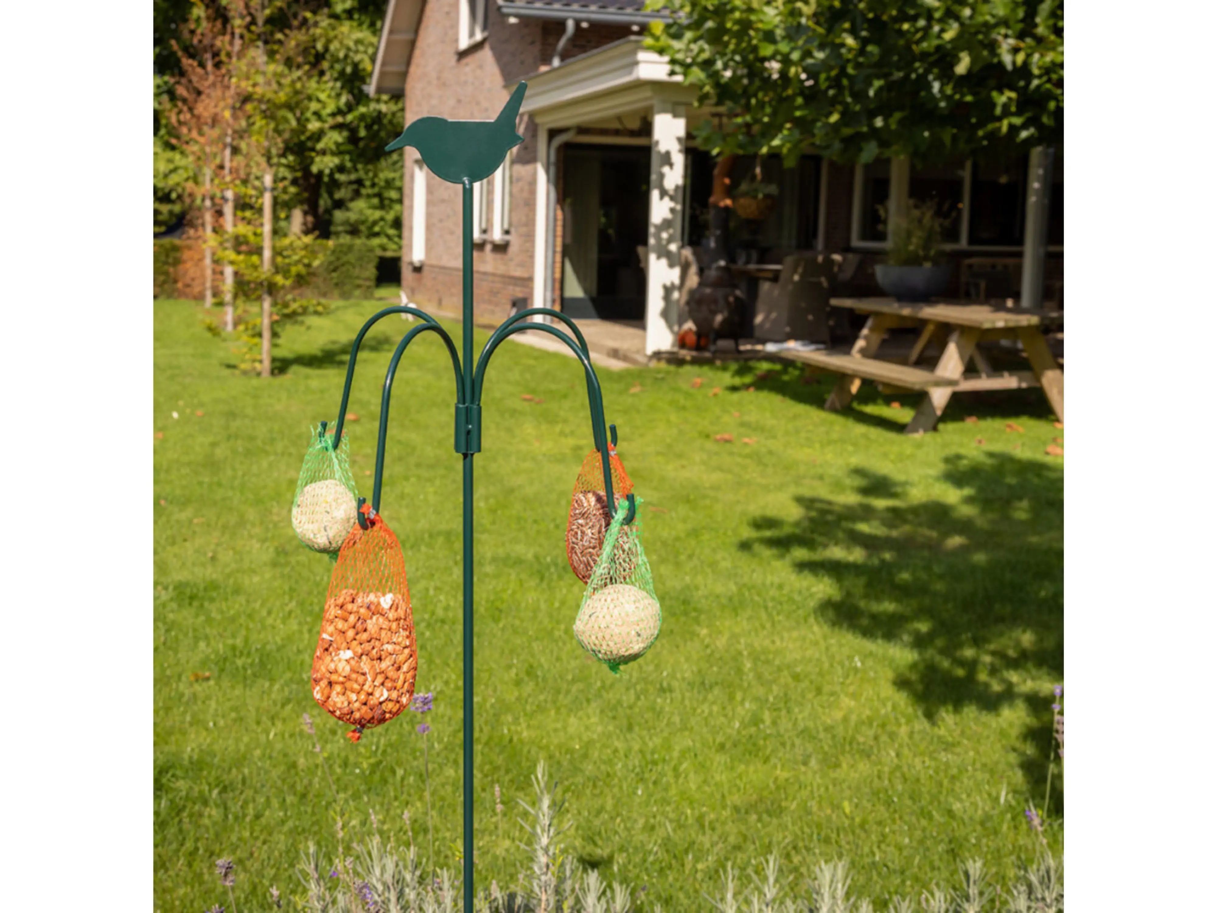 Dit voederstation van Esschert Design met vier haken is perfect voor het ophangen van vetbollen, vogelvoersilo's en vetblokhouders. Het is eenvoudig te monteren en dankzij de grondverankering kan het systeem stevig in de grond worden geprikt. Bovendien prijkt er bovenaan de voederhanger een mooi decoratief vogeltje.