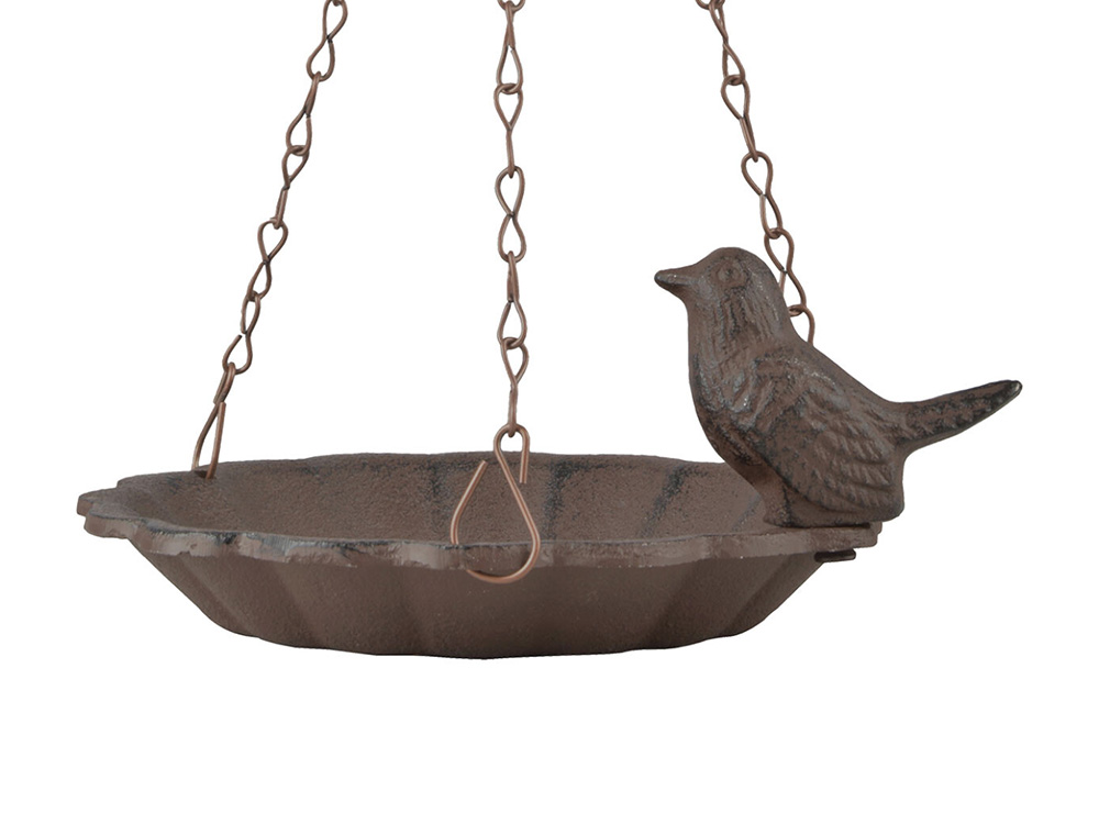 Een hangend vogelbad van Esschert design, gemaakt van gietijzer en versierd met een charmant vogeltje op de rand. Het vogelbad wordt geleverd met drie ophangkettingen en een ophanghaak.