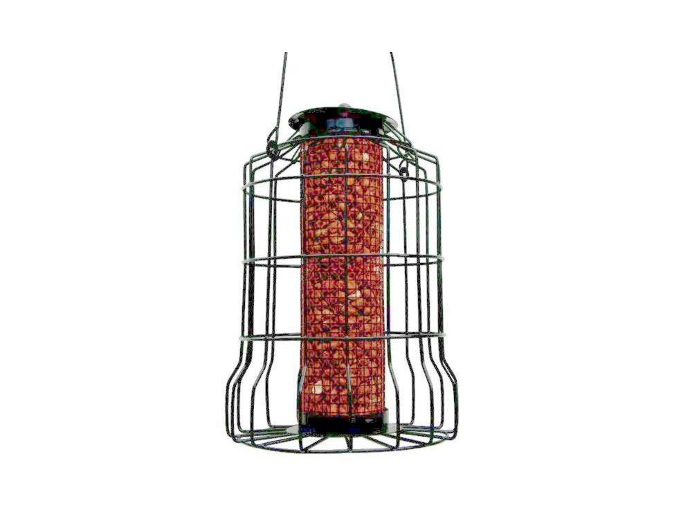 Deze voedersilo is omgeven door een elegant gaasraster, waardoor alleen kleinere tuinvogels zoals meesjes, mussen en roodborstjes toegang hebben. De beschermkooi voorkomt dat grotere vogels zoals eksters, kraaien en duiven, evenals eekhoorns, de kleinere vogels verjagen of al het voer opeten.