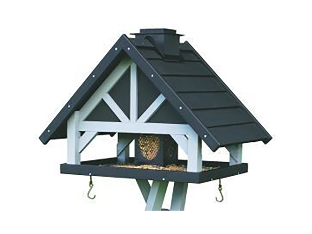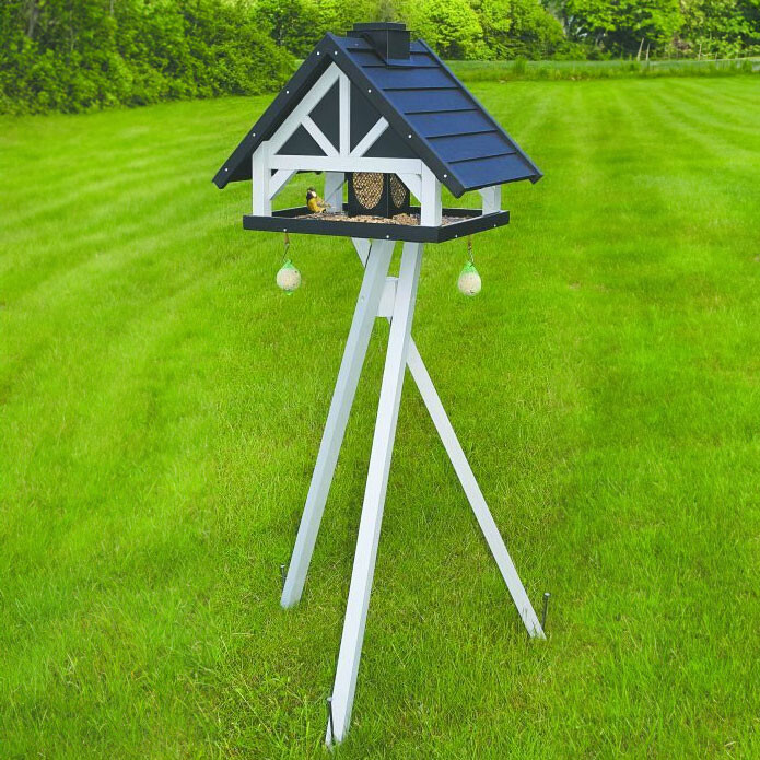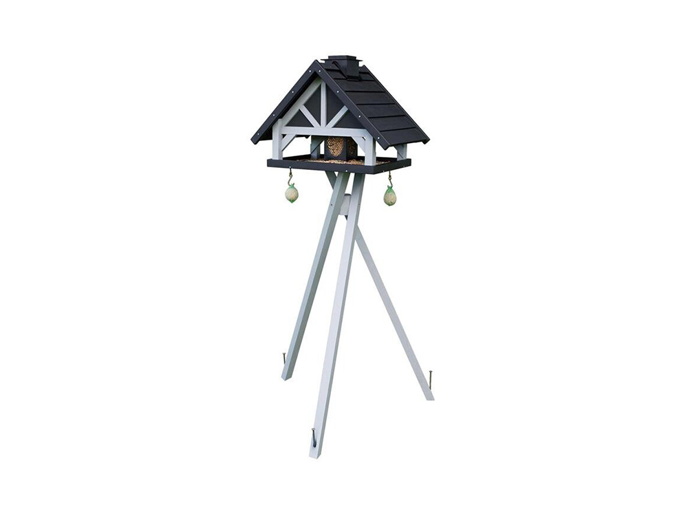 Mooie voedervilla voor tuinvogels op een stevige houten voet. Deze decoratieve voedertafel heeft een groot dak en een voedertafel dat aan de vier zijden open is! Het huisje wordt ondersteund door drie poten die met de meegeleverde grondpinnen in de grond kan worden verankerd.