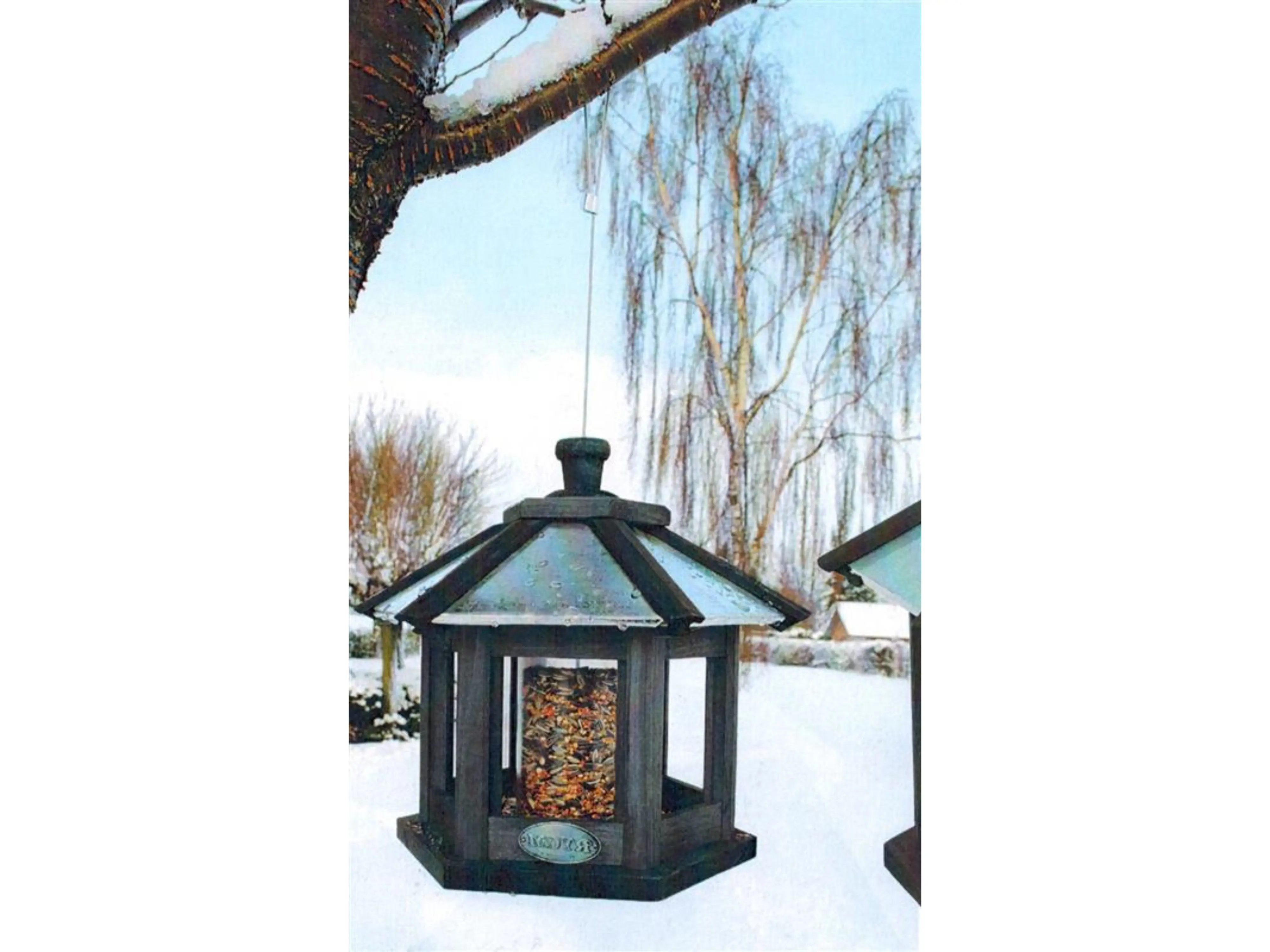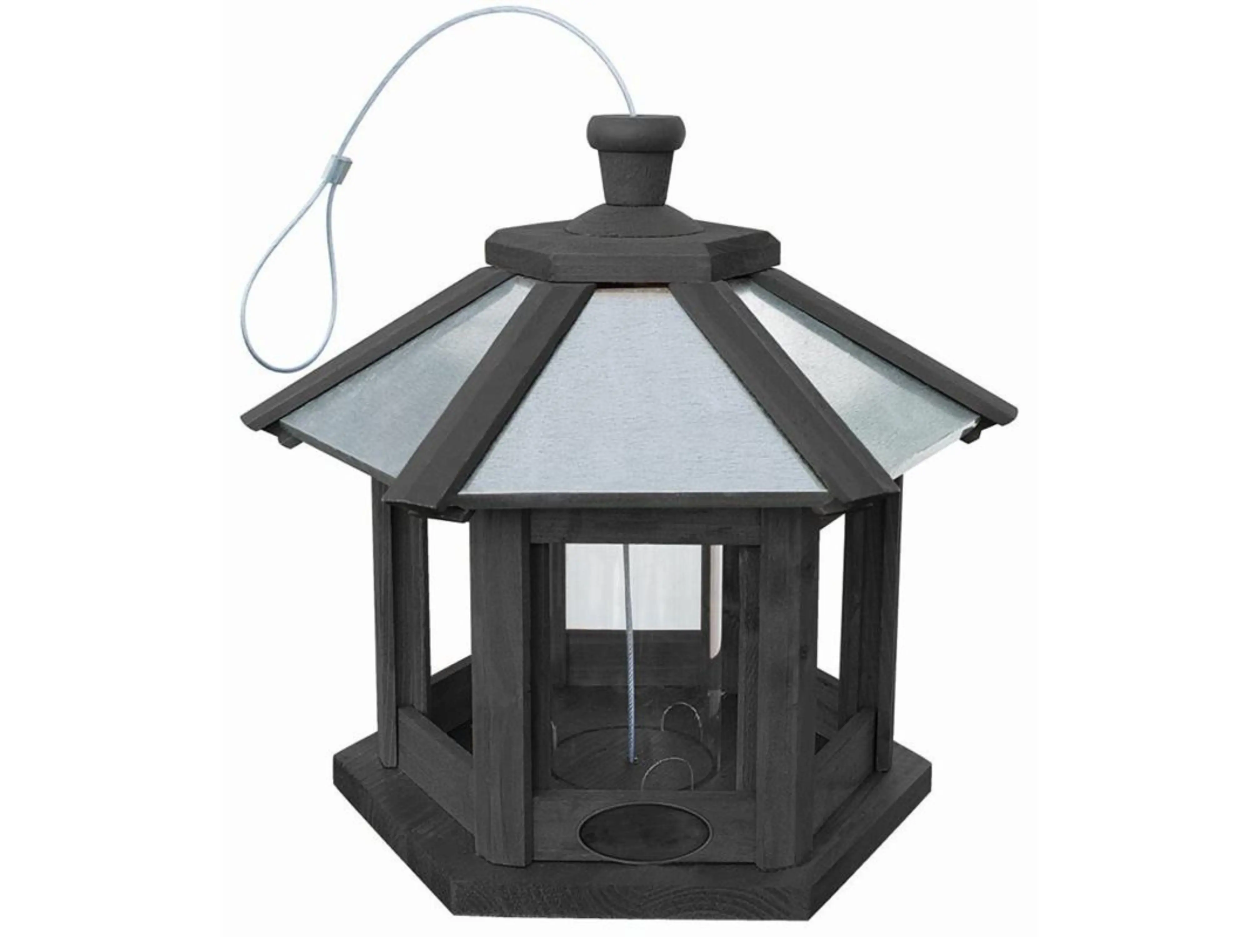 Het voederhuis kan op een tafel worden geplaatst, maar het kan met de zeer stevige, geplastificeerde staaldraad ook makkelijk worden opgehangen aan een tak, pergola, rozenboog,... Bijvullen kan makkelijk via het afneembare deksel.