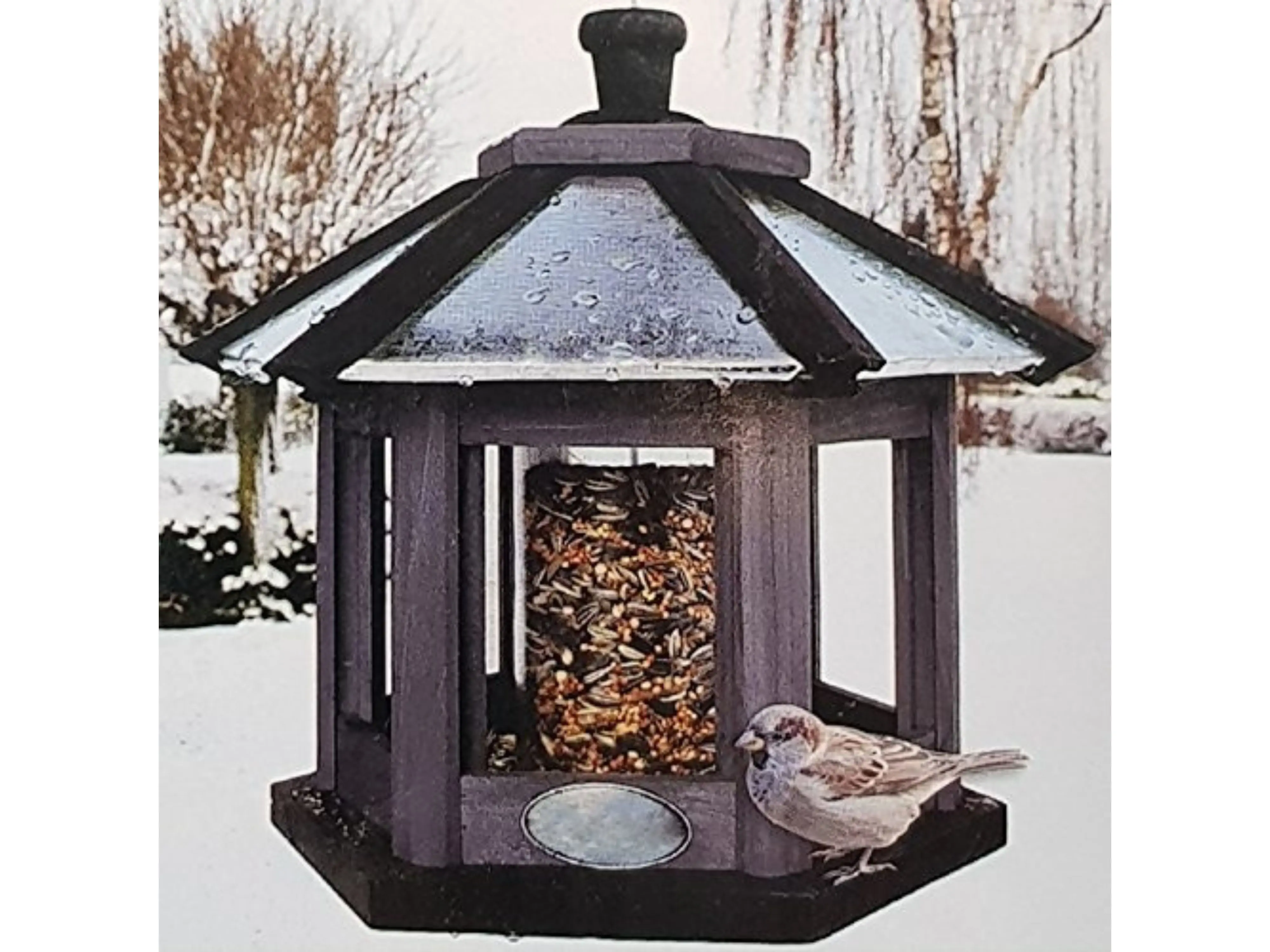 Mooi zeskantig vogelvoederhuis met in het midden een ingebouwde zadenvoedersilo. Het voederhuis is voorzien van een gegalvaniseerd afdak waardoor het vogelvoer en de smullende vogels ook bij regenweer lekker droog blijven.