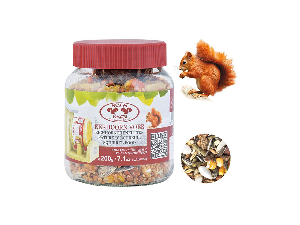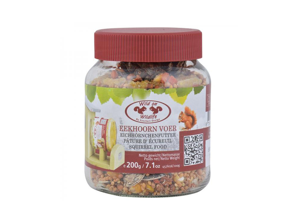 Handig potje van 200 g gezond eekhoornvoer, zorgvuldig uitgebalanceerd met noten, zaden, mais en gezonde vetten.