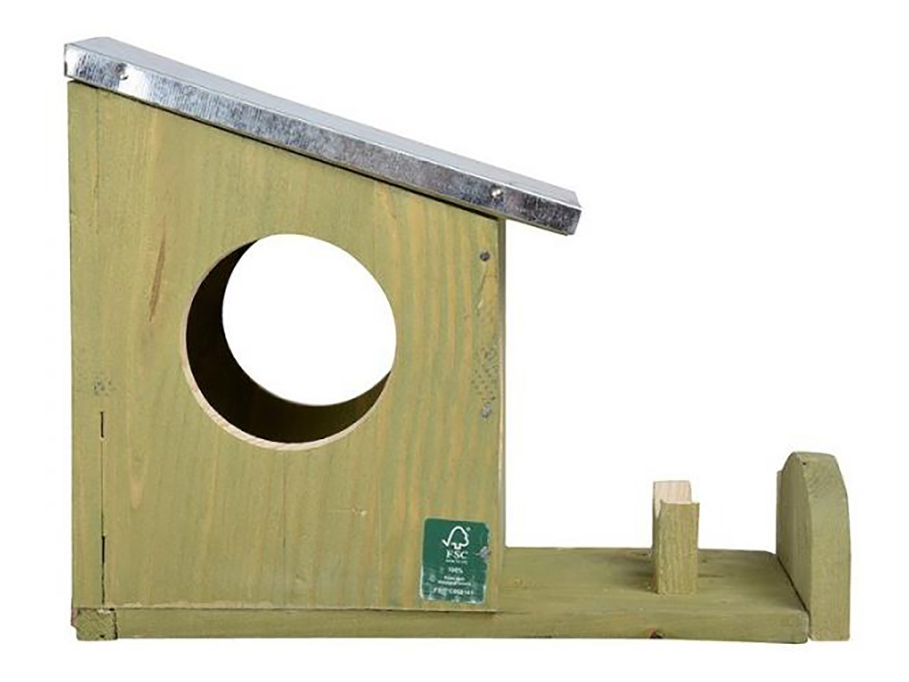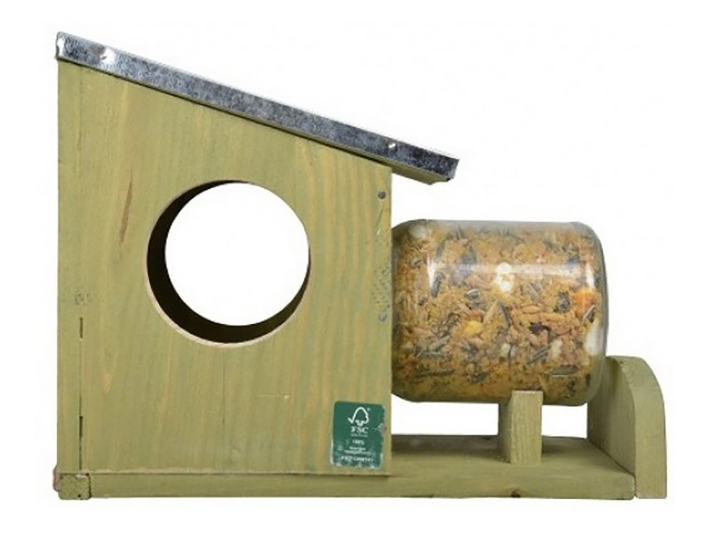 Het huisje is gemaakt van grenenhout en is uitgerust met een zinken dak tegen de regen. Dit kastje is speciaal ontworpen voor het voederen van eekhoornvoer in een potje. Het potje past perfect vooraan in de potjeshouder van dit kastje.