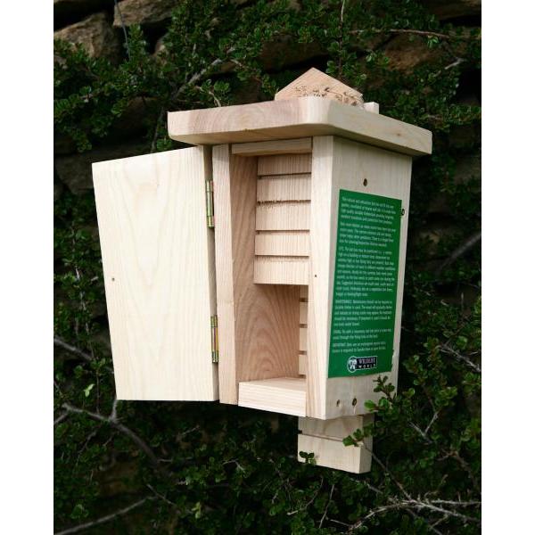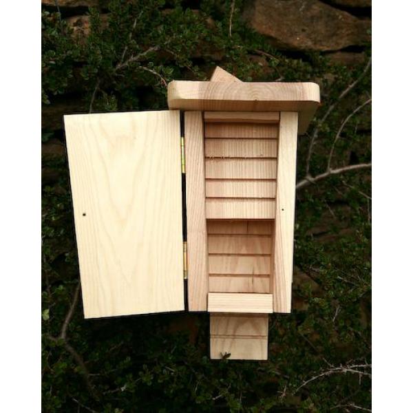 De smalle ingang van deze vleermuizenkast zorgt ervoor dat de vleermuizen rustig slapen, zonder bedreiging van roofvogels. Het luik aan de voorkant kan geopend worden ter observatie, of om de vleermuizenkast te reinigen. Doe dit niet in de periode van maart tot oktober, aangezien je daarmee de vleermuizen kunt afschrikken. Deze vleermuizenkast met twee kamers is binnenin uitgerust met een 'laddertje' waaraan de vleermuizen ondersteboven hangen te slapen. De vleermuiskast moet hoog, tussen 2,5 en 5 m, aan een gebouw of volwassen boom worden gehangen met behulp van de voorgeboorde achterplaat.
