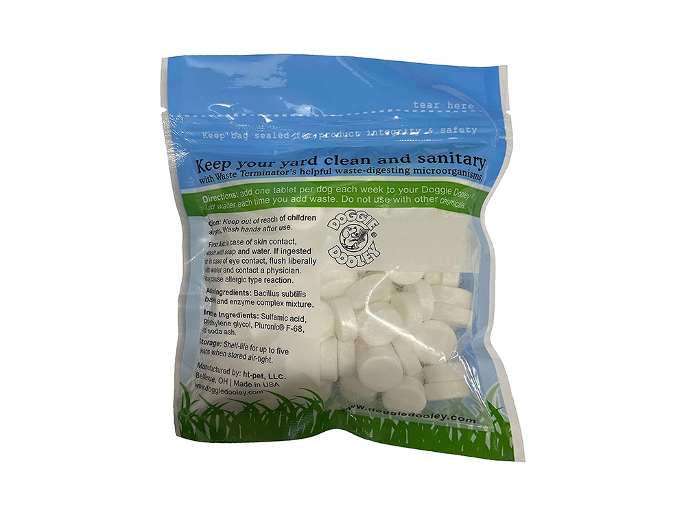 Speciale verteringstabletten voor het biologisch afbreken van hondendrollen. Iedere tablet bevat duizenden efficiënte micro-organismen die het verteringsproces van organisch afval met zienderogen versnellen. De tabletten zijn milieuvriendelijk en niet giftig. De enzymen zijn biologisch afbreekbaar tot onschadelijke aminozuren.